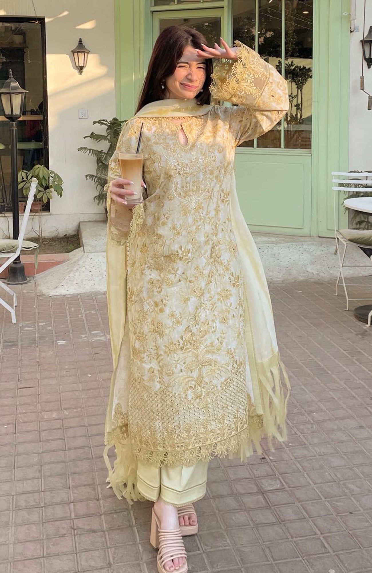 DESCRIPTION: LAWN EMBROIDERED DIGITAL PRINTED FRONT (1 PC) LAWN DIGITAL PRINTED BACK (1 M) LAWN EMBROIDERED DIGITAL PRINTED SLEEVES (2 PCS) ORGANZA EMBROIDERED FRONT+BACK+SLEEVES BORDER (2.97 M) SILK DIGITALPRINTED DUPATTA (2.50 M) COTTON DYED TROUSER (1.83 M)