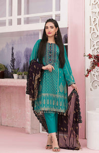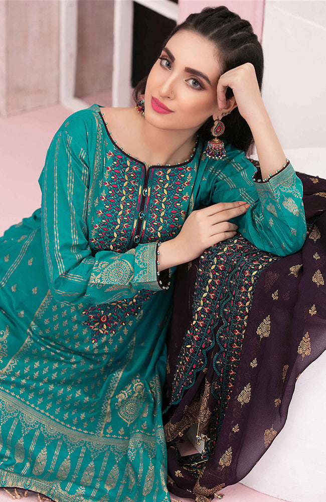 3 Piece Gold Printed Embroidered Lawn Suit with Embroidered Chiffon Dupatta.