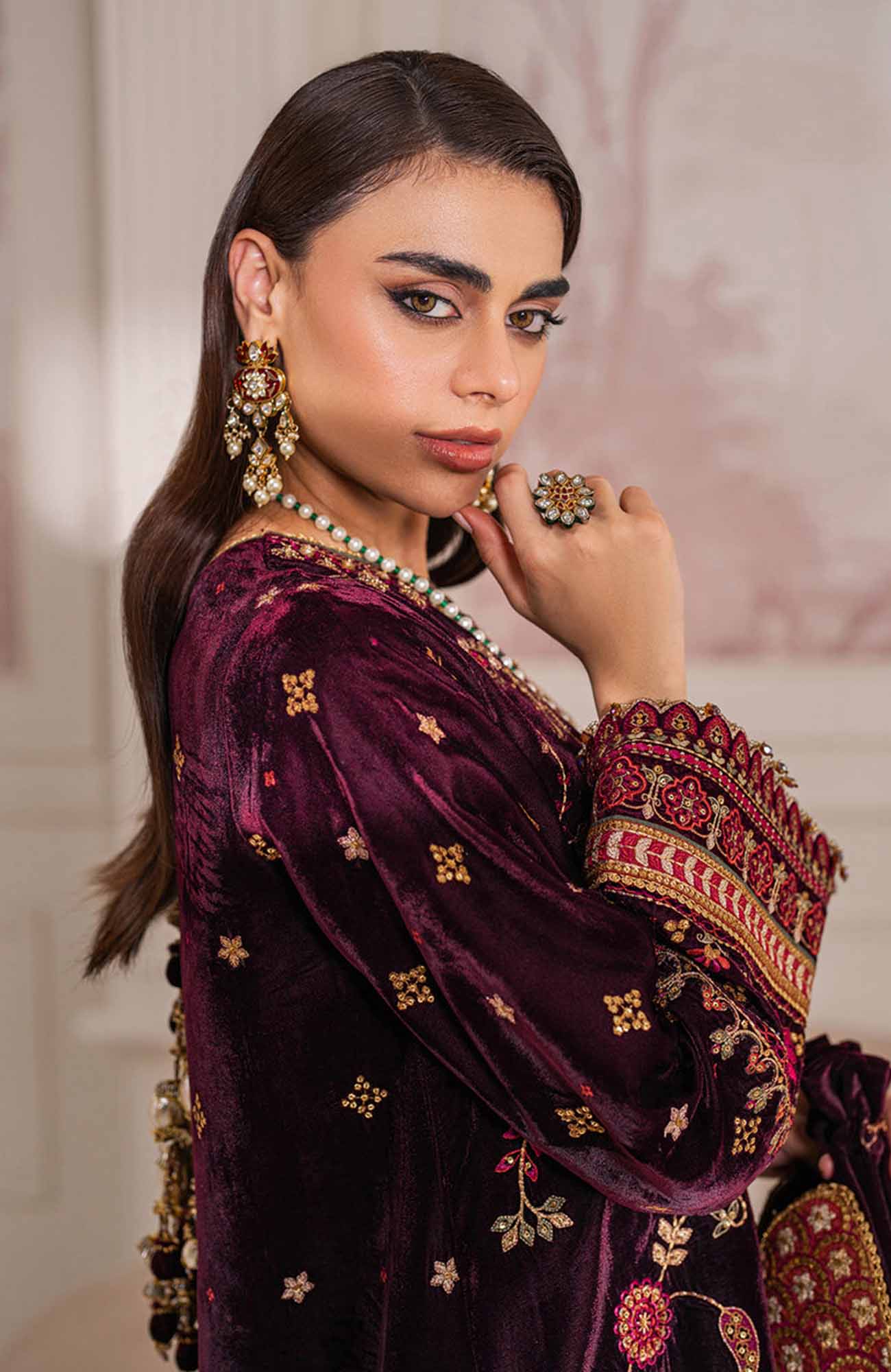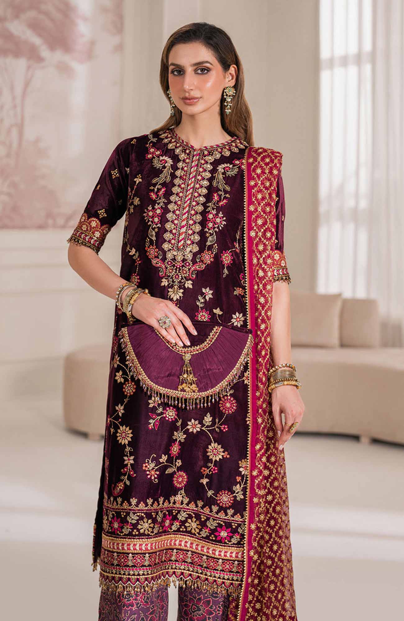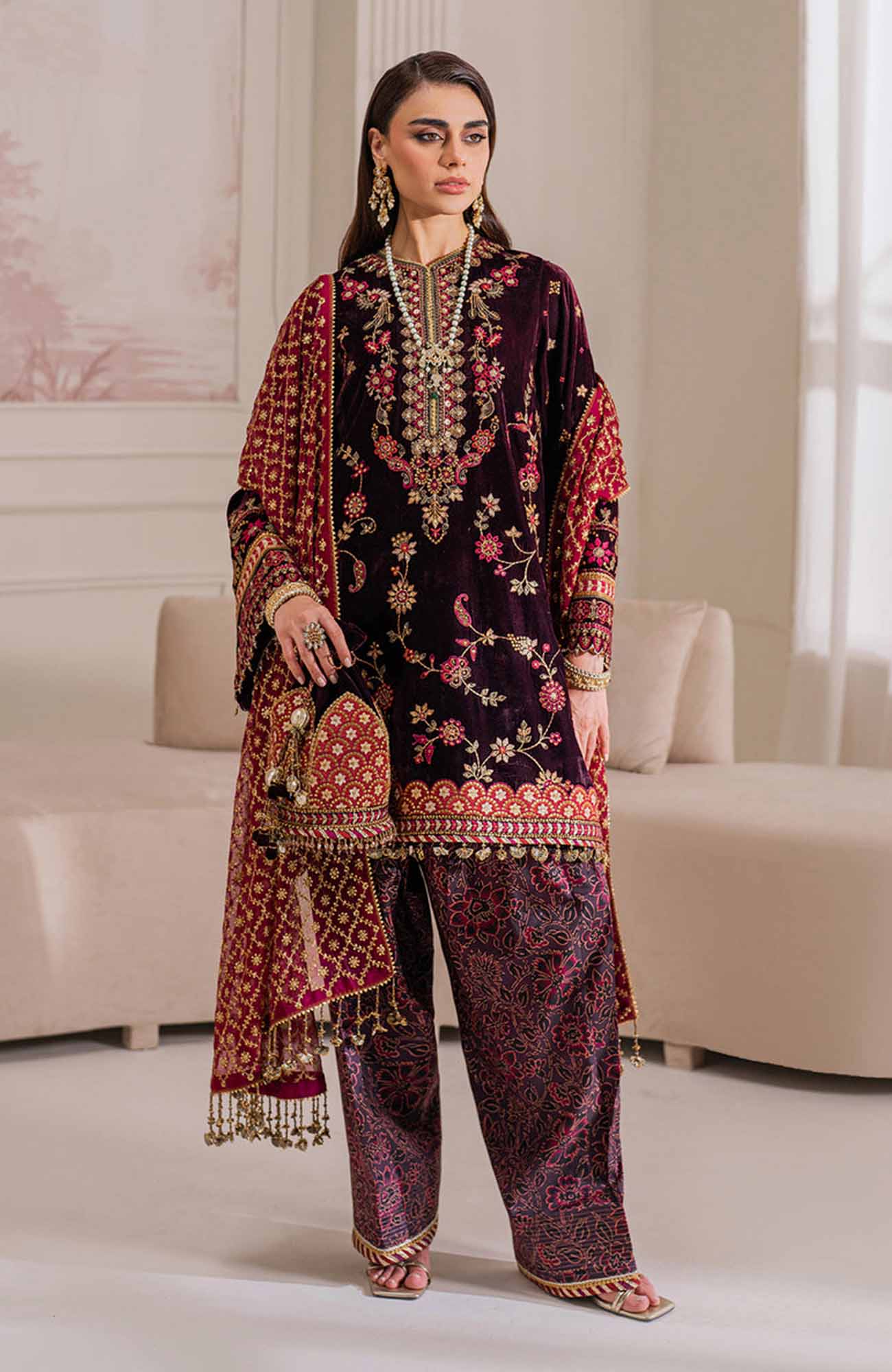 DESCRIPTION: Embroidered velvet front (1 yard) Embroidered velvet back & sleeves (2 yard) Embroidered velvet front & back (2) (1.80 each) Embroidered silk front & back border (1.80 yard) Embroidered chiffon dupatta (2.70 yard) Digital printed silk trouser (2.50 yard)