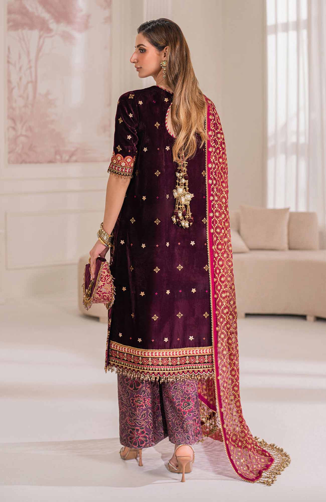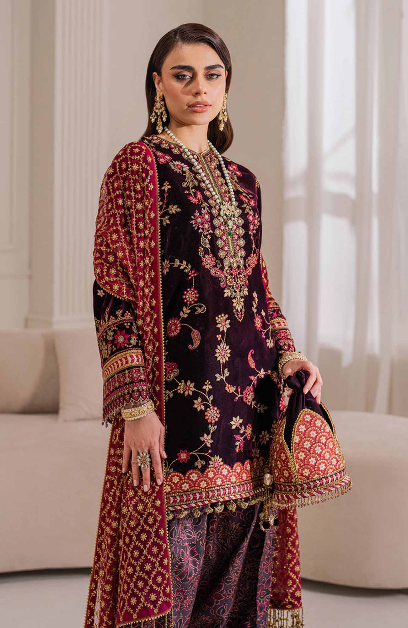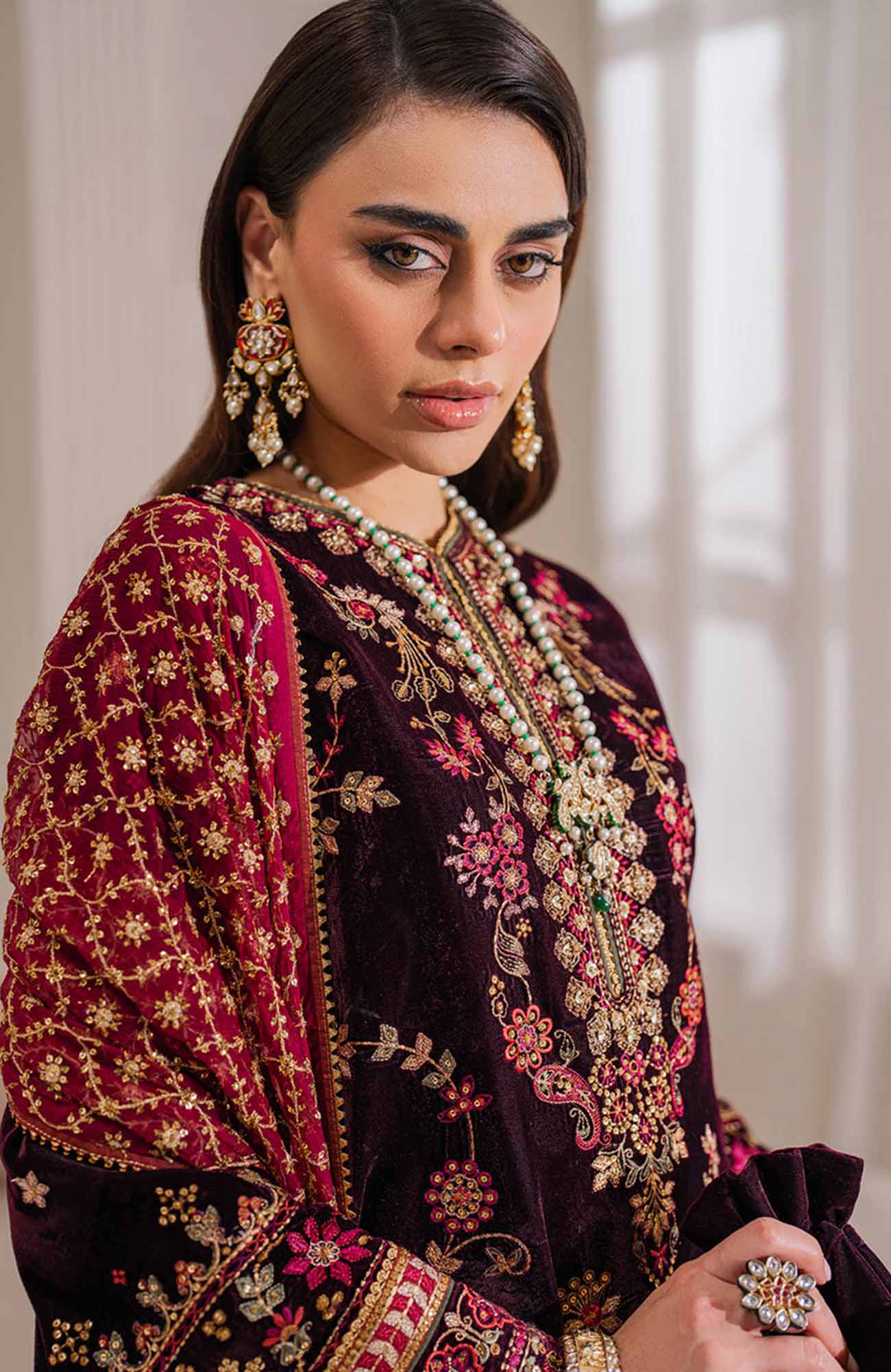 DESCRIPTION: Embroidered velvet front (1 yard) Embroidered velvet back & sleeves (2 yard) Embroidered velvet front & back (2) (1.80 each) Embroidered silk front & back border (1.80 yard) Embroidered chiffon dupatta (2.70 yard) Digital printed silk trouser (2.50 yard)