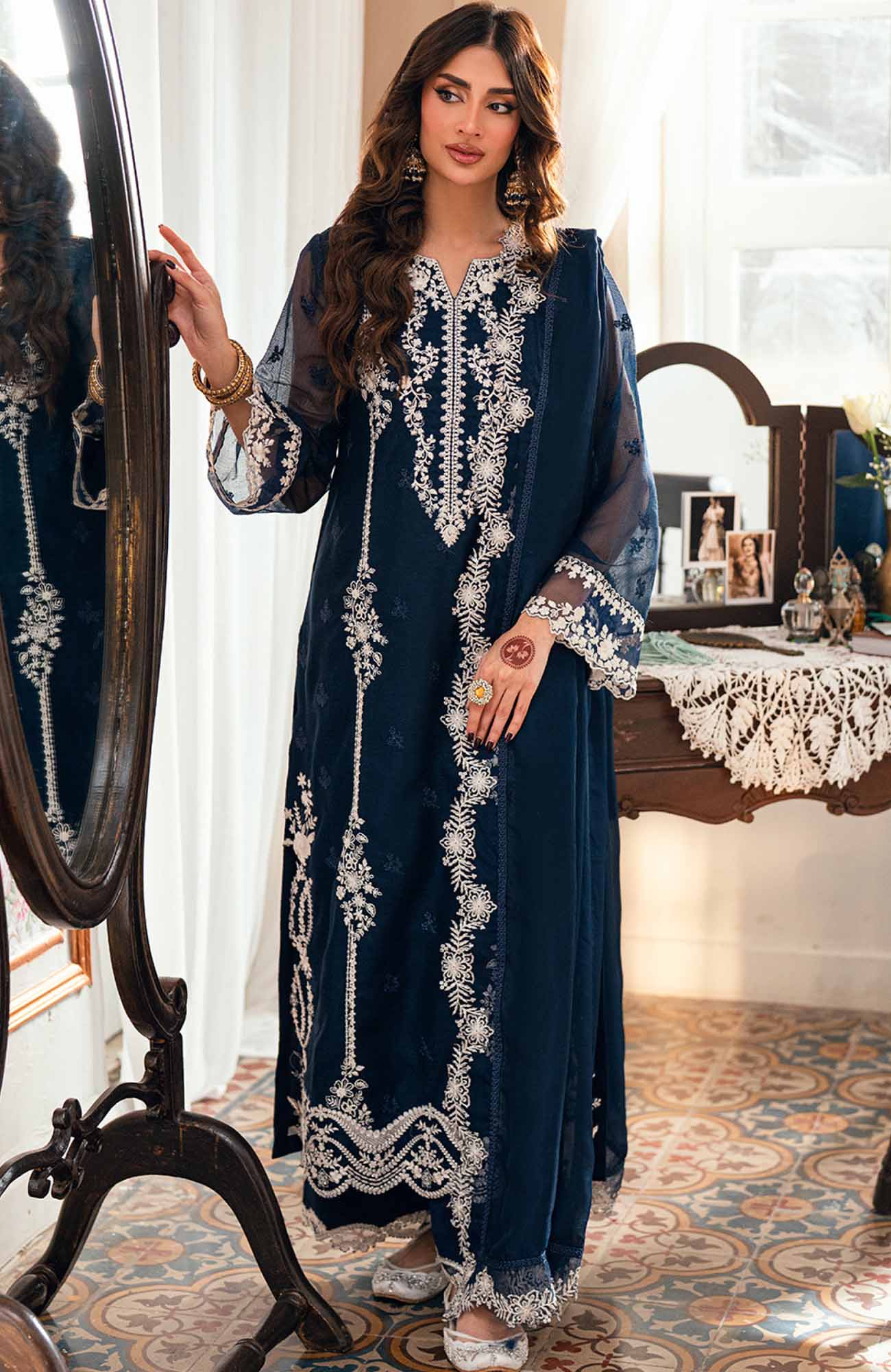 Eid Ensembles By Azure Unstitched Lawn Embroidered 3 Piece Suit - AZRESL140- Stellar Blue - Summer Collection