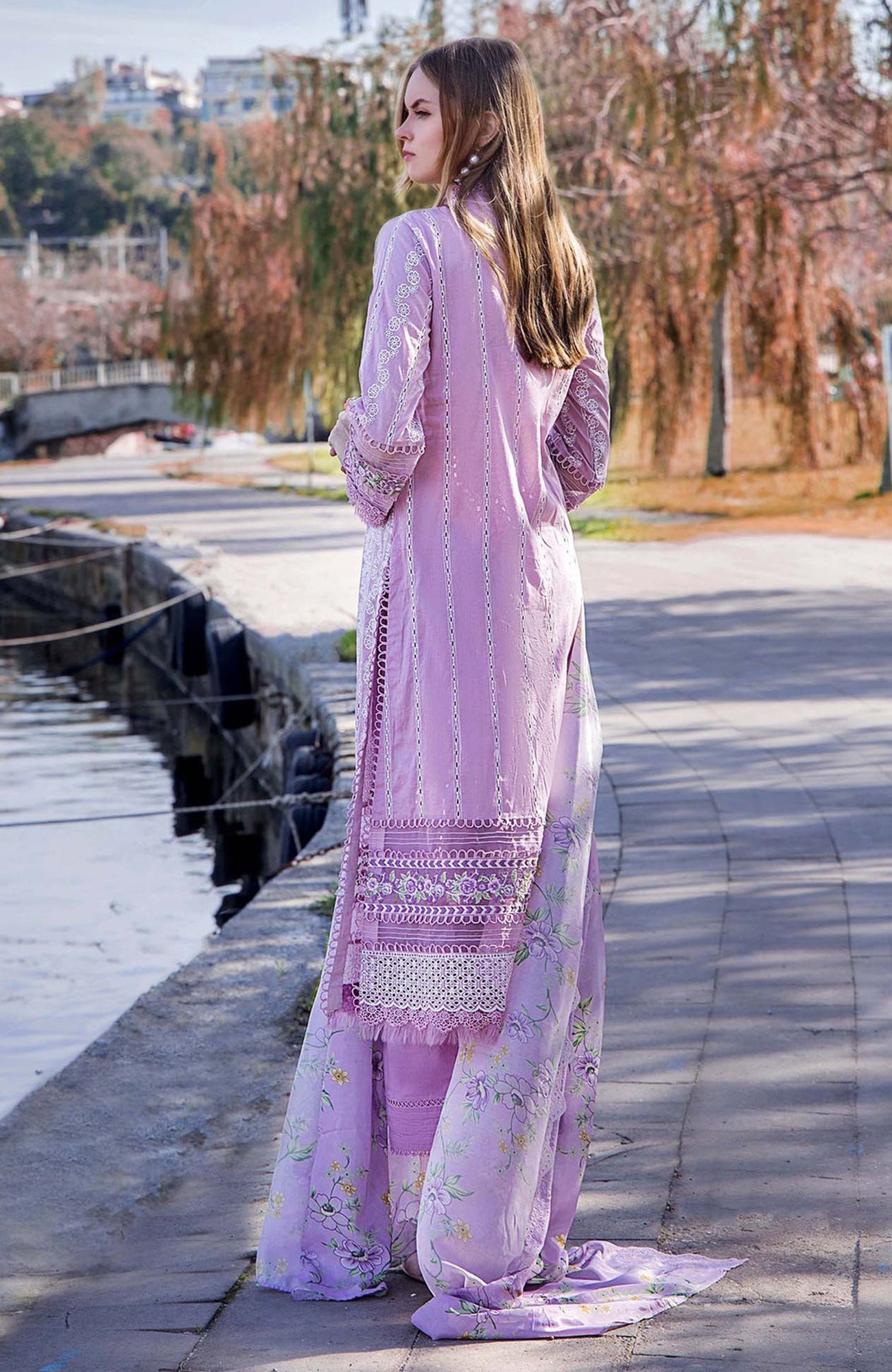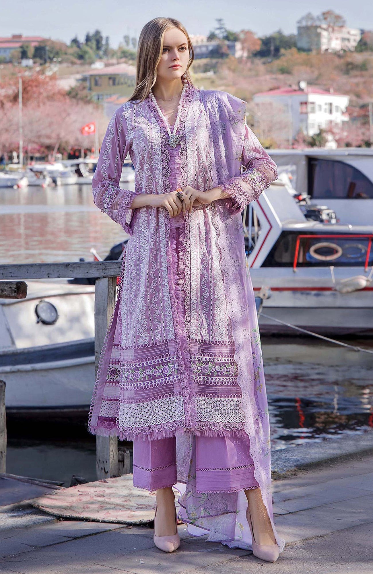 DESCRIPTION: • Schiffli Embroidered Lawn Shirt • Dyed Cotton Trouser • Printed & Embroidered Silk, Net and Organza Dupatta