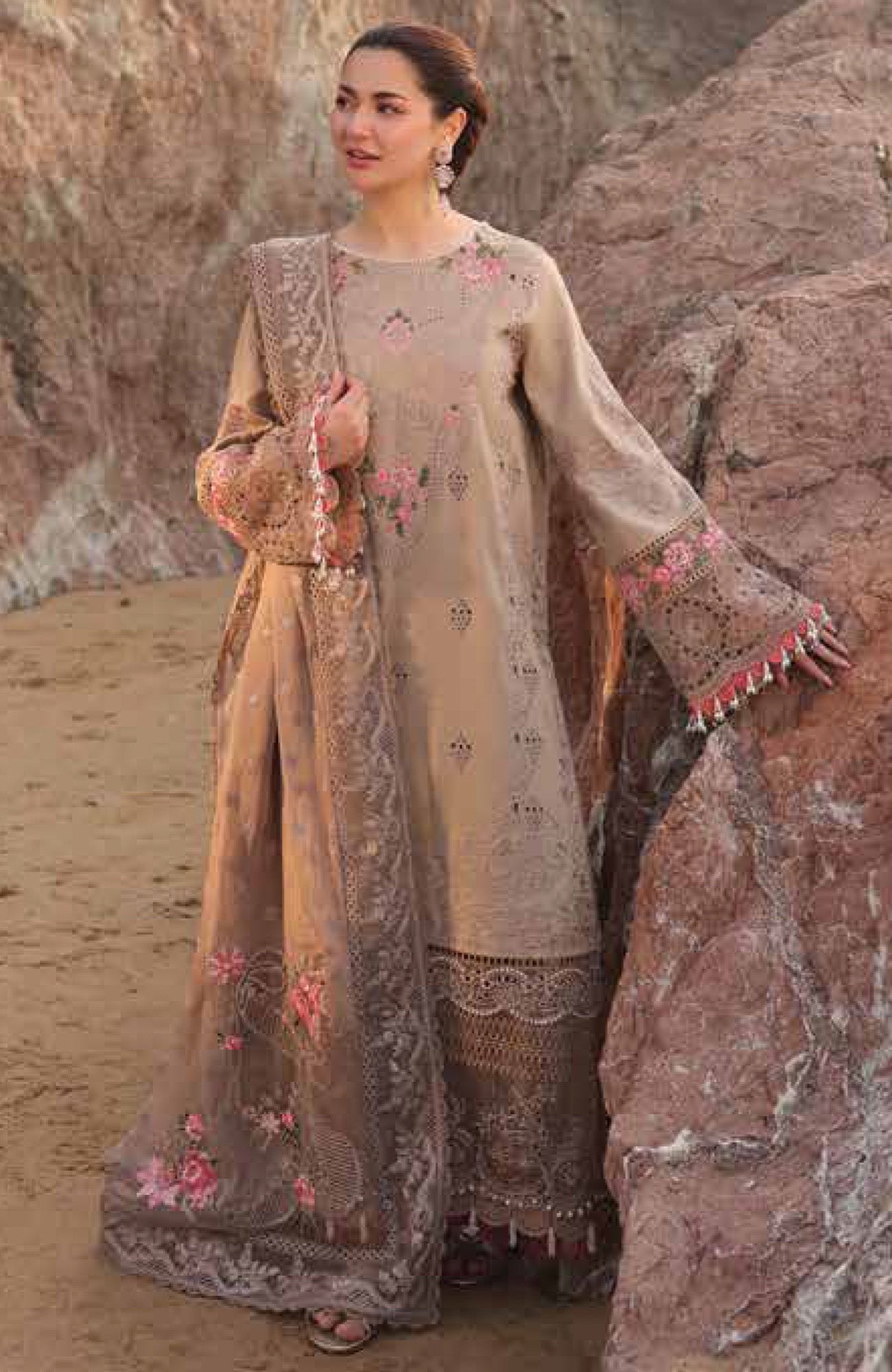 DESCRIPTION: Embroidered Lawn Front Embroidered Lawn Sleeves Embroidered Organza Border for Sleeves Embellished Embroidered Organza with Pearls for Border Embroidered Organza Border for Back Dyed Lawn Back Embroidered Chiffon Dupatta Dyed Cotton Trousers