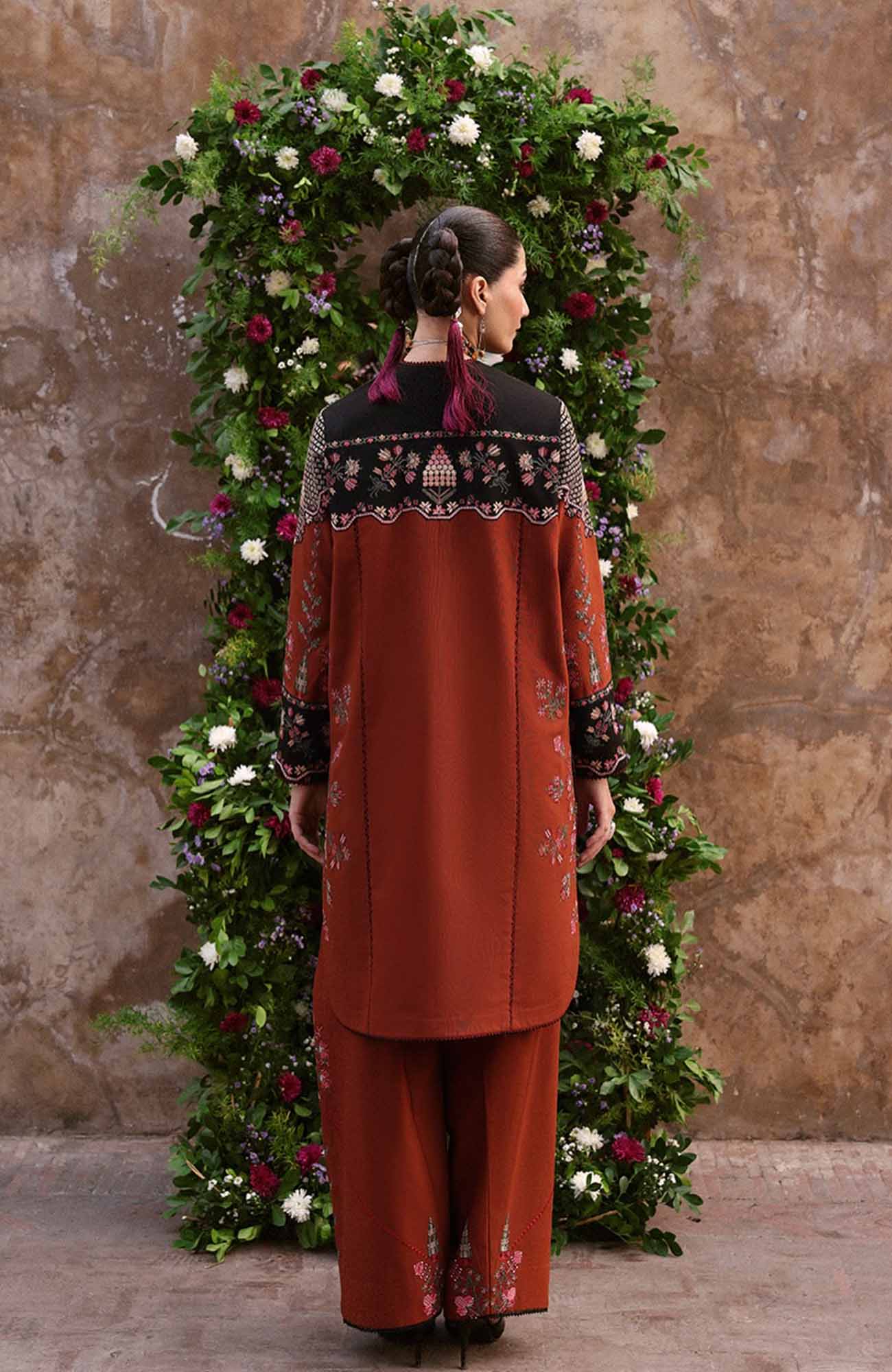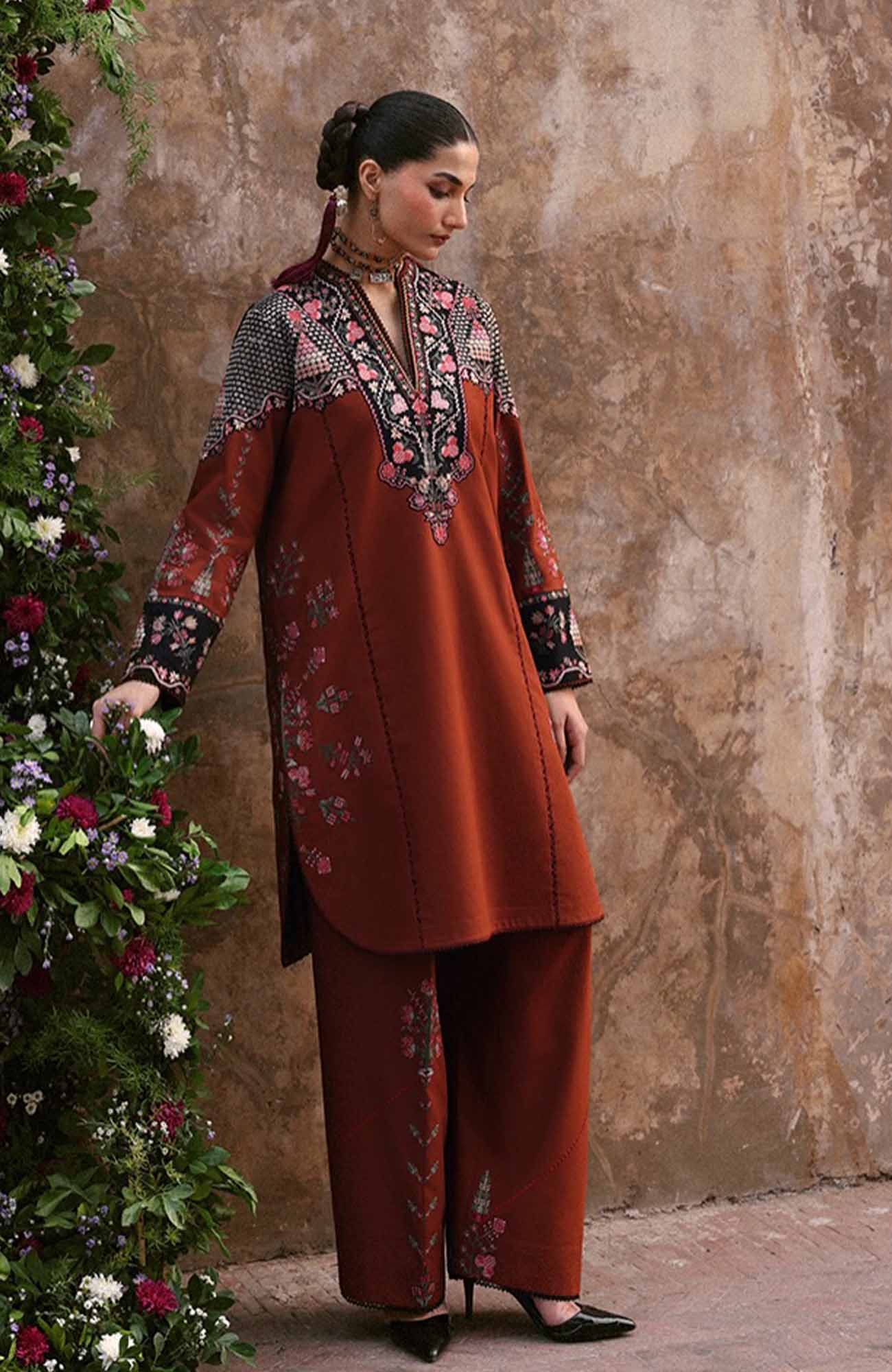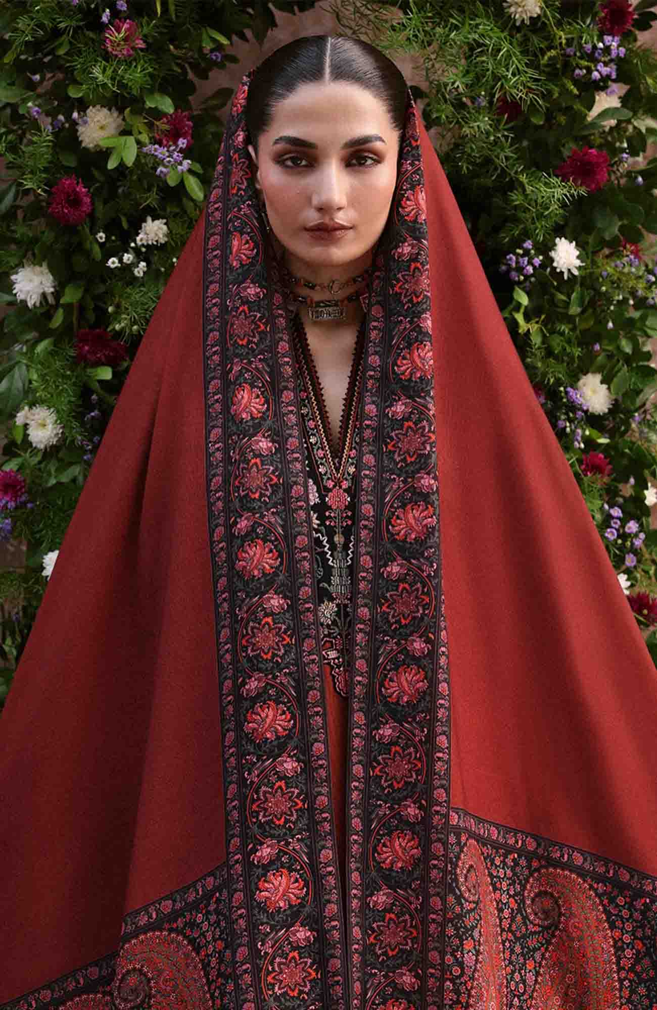 Description: This traditional ensemble features a multicolor embroidered shirt adorned with a black neckline patch, complemented by intricately detailed sleeves with black borders and shoulder accents. The coordinating shalwar mirrors the embroidery, while a printed poly wool shawl drapes gracefully, adding texture and classic refinement.