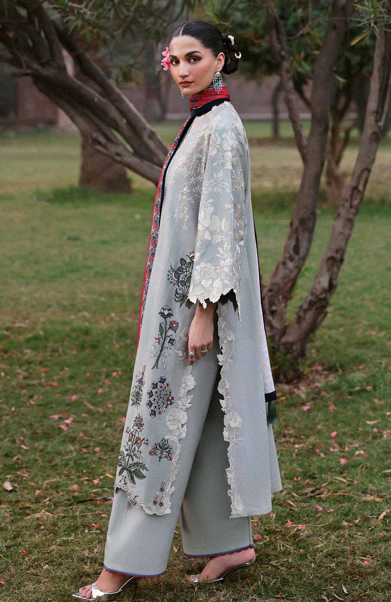 Description: This graceful ensemble features a monochrome floral-embroidered shirt with matching embroidered sleeves that exude refined sophistication. The daaman stands out with intricate multicolor floral embroidery, adding a vibrant contrast to the subtle base. Paired with a dyed trouser and a beautifully printed wool shawl, the outfit blends classic elegance and timeless craftsmanship with a touch of contemporary charm.