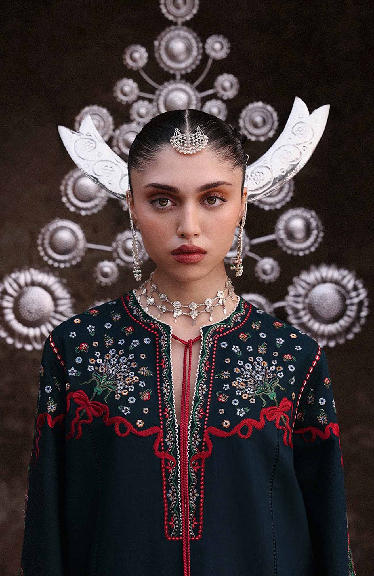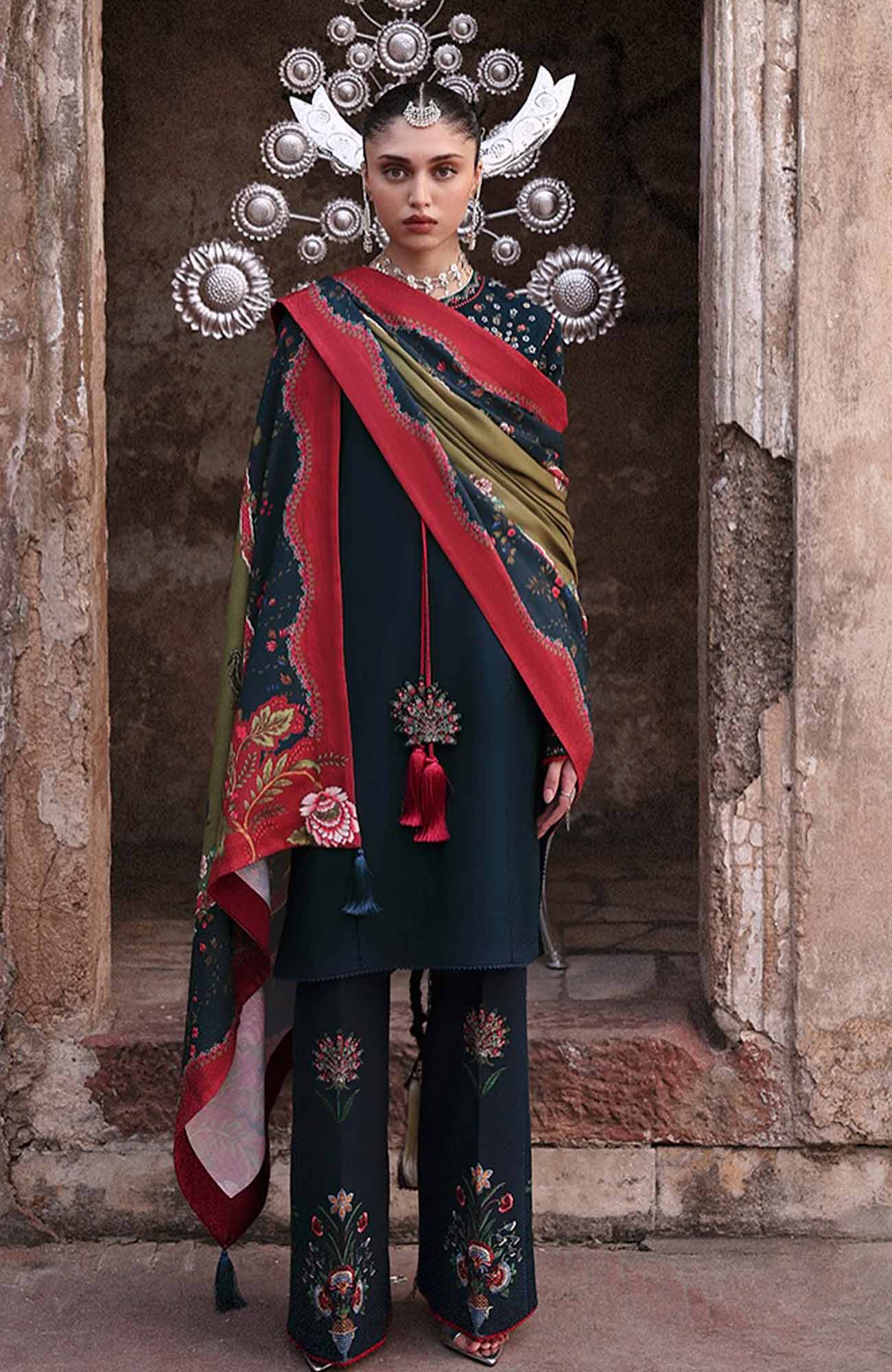 Description: This exquisite ensemble showcases a beautifully adorned shirt featuring intricate multicolor traditional embroidery, reflecting timeless craftsmanship. The sleeves and trouser are equally detailed with rich, multicolored traditional motifs, creating a harmonious and regal composition. A printed wool shawl completes the outfit, adding warmth and grace to this classic look.