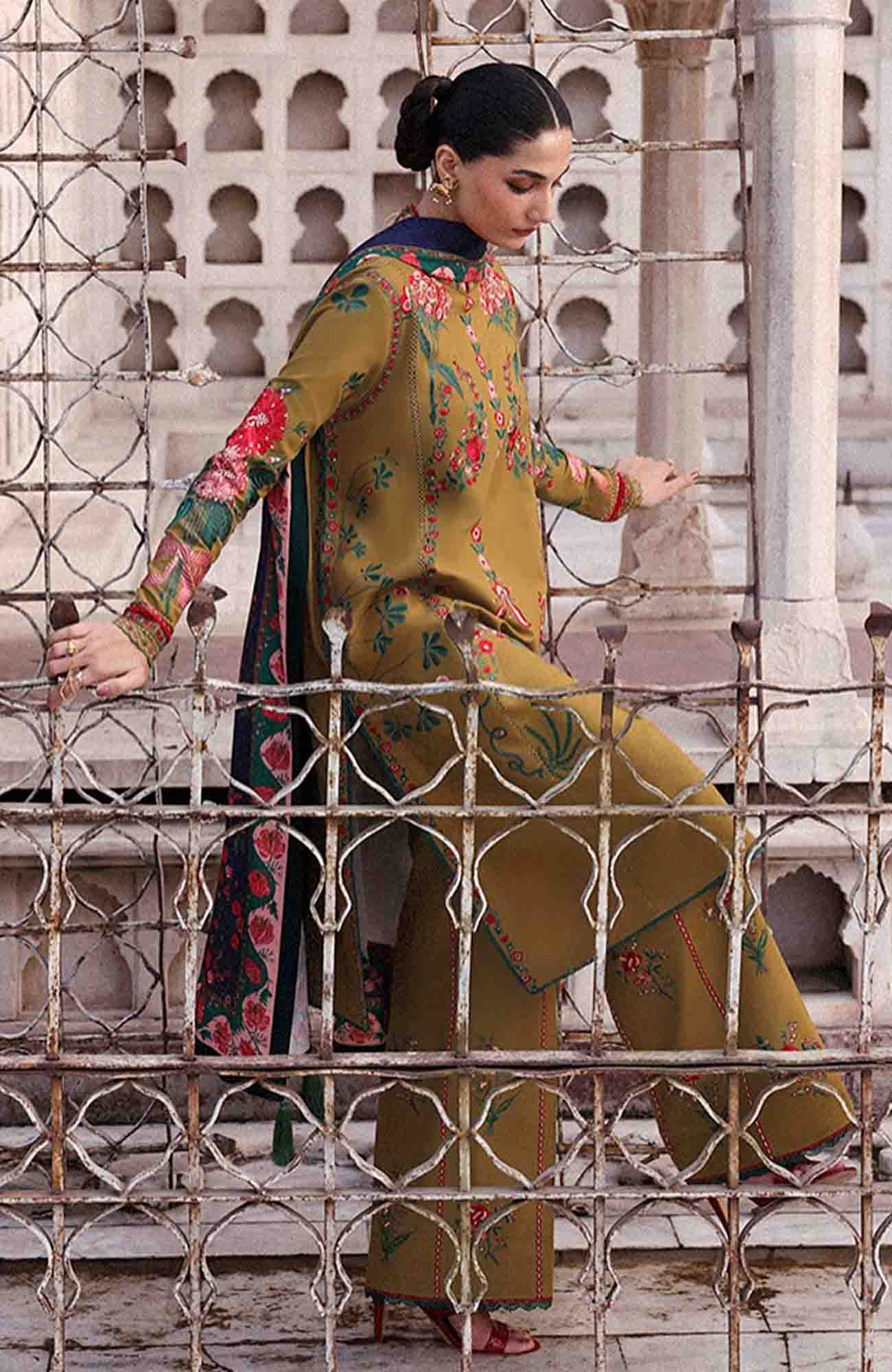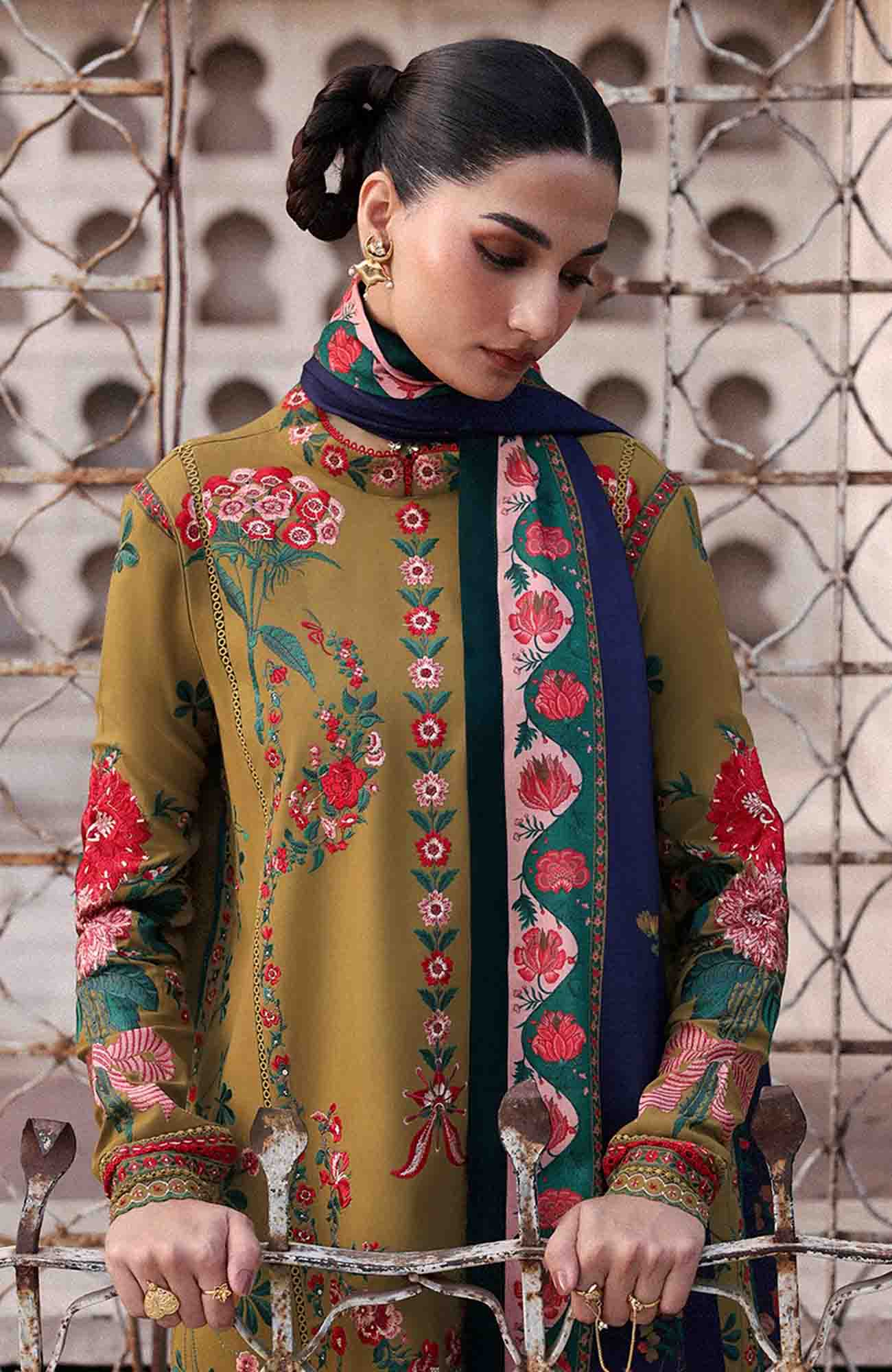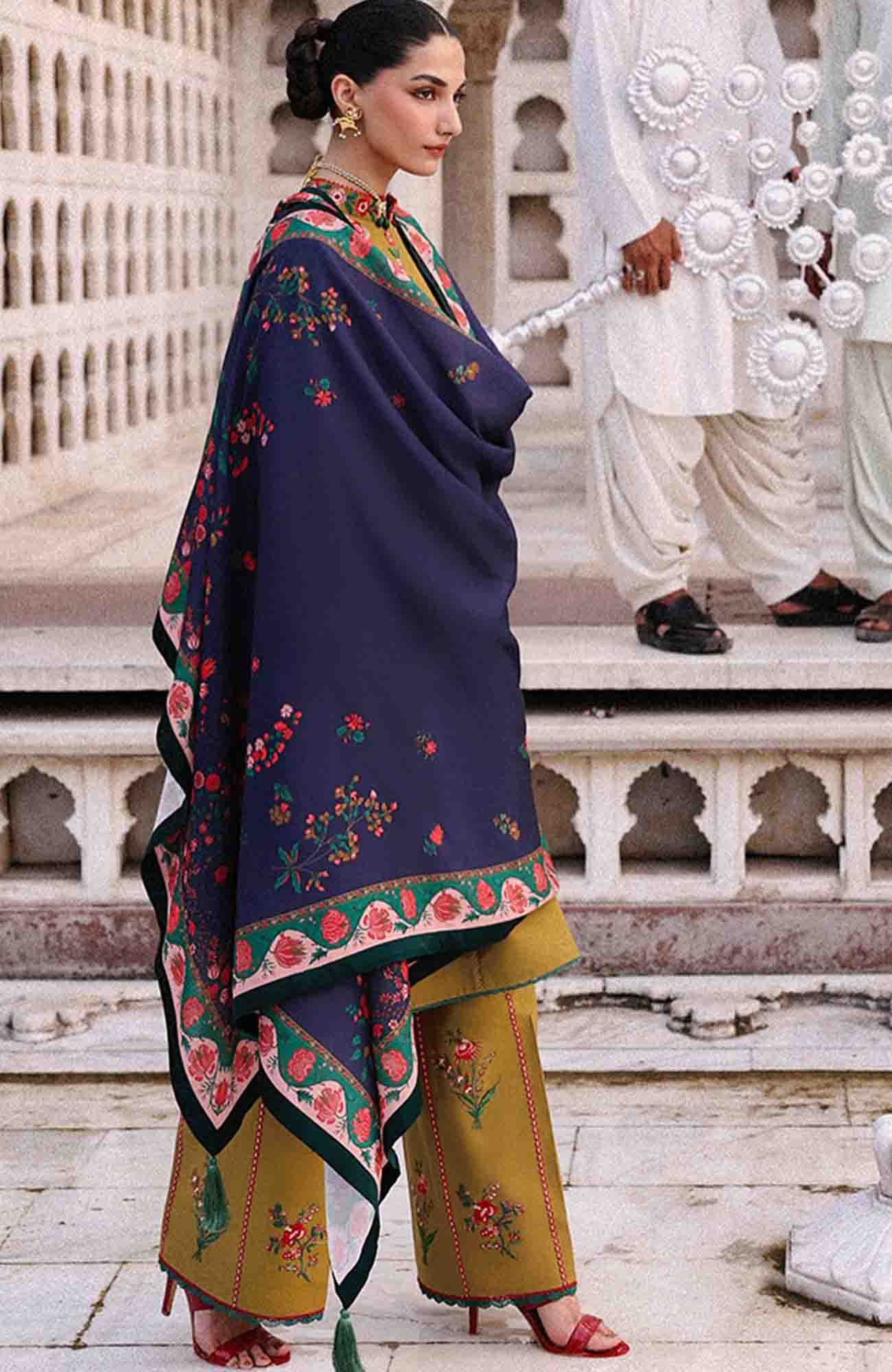 Description: This outfit features a mustard-colored shirt richly embroidered with multicolored floral patterns that extend across the front and sleeves, adding vibrant pops of red, pink, and green. The matching trousers carry coordinated floral embroidery, creating a seamless and elegant ensemble. A printed wool shawl completes the outfit, providing both warmth and a graceful, cultural accent.