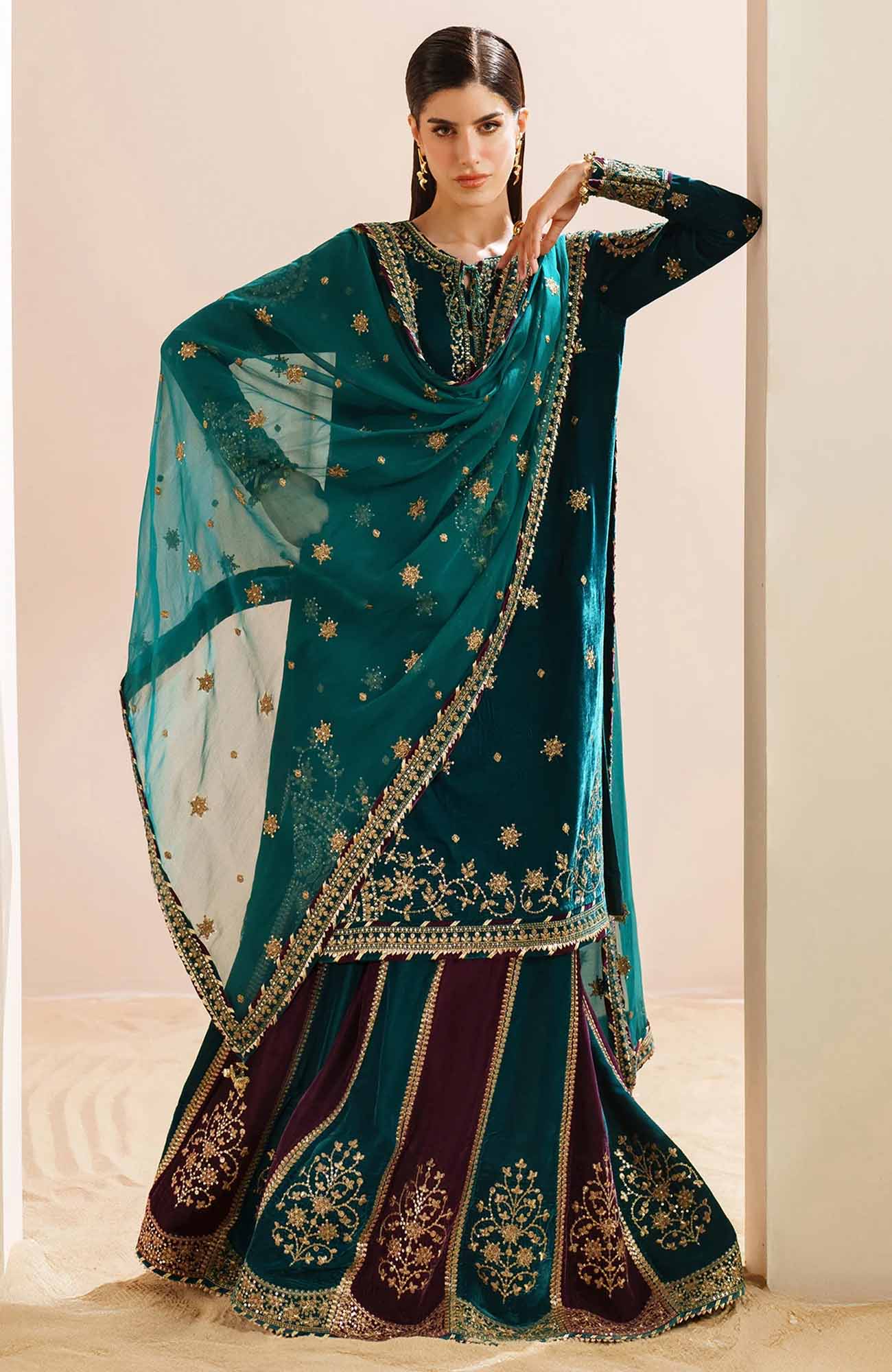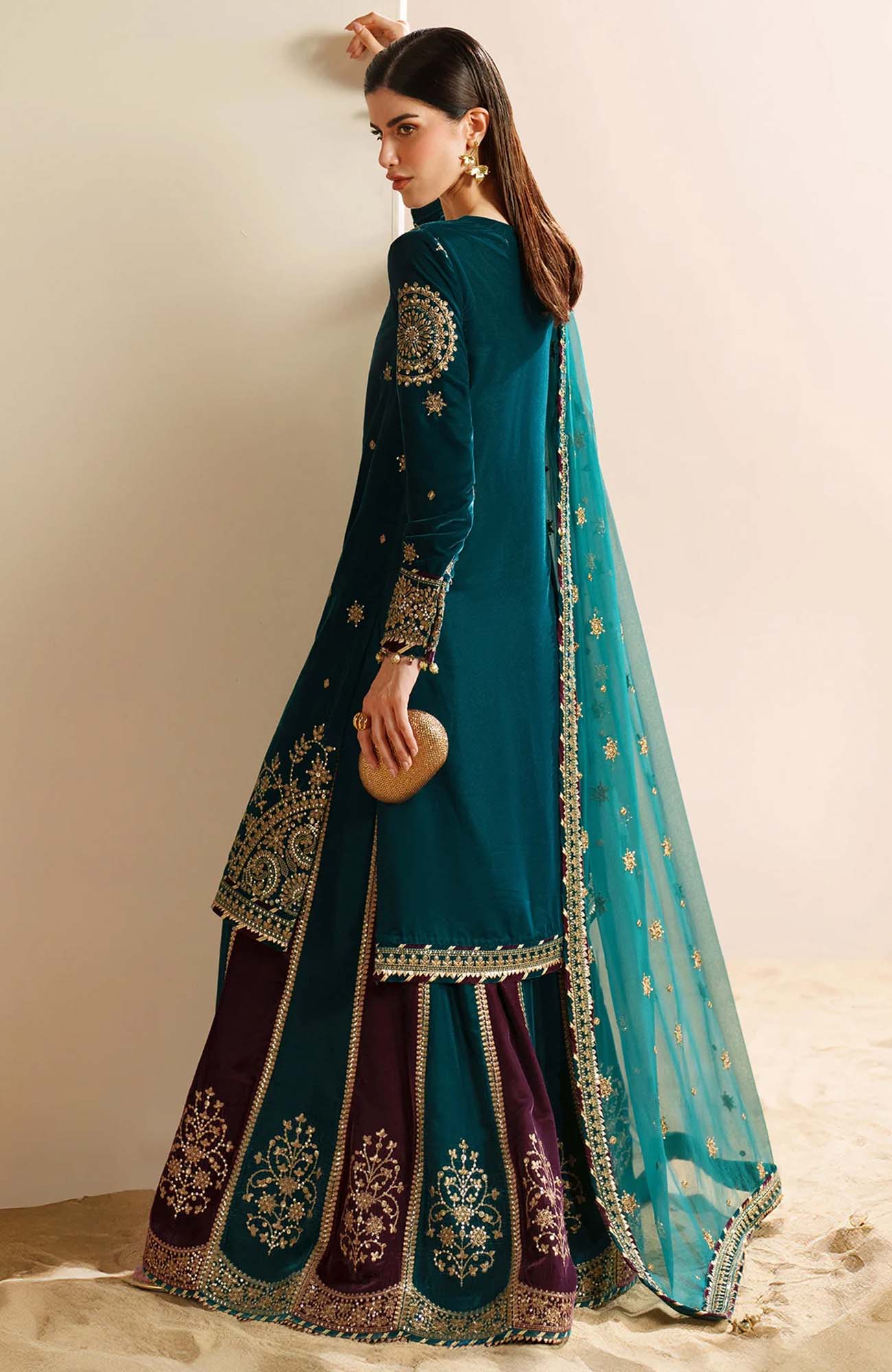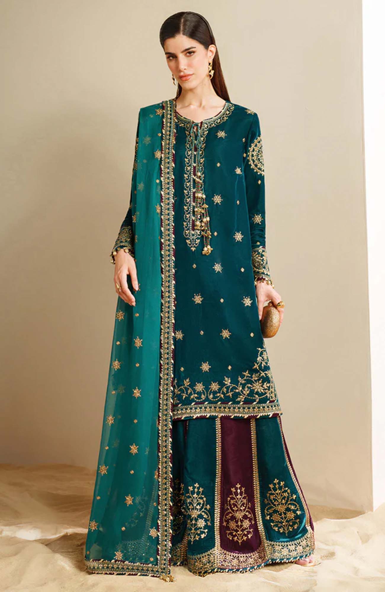 DESCRIPTION: Embroidered Pure Velvet Front Embroidered Pure Velvet Sleeves Embroidered Velvet Front, Back & Sleeves Border Embroidered Pure Velvet Bottom Dyed Pure Velvet Back Embroidered Crinkle Chiffon Dupatta Embroidered Pure Velvet Dupatta Borders