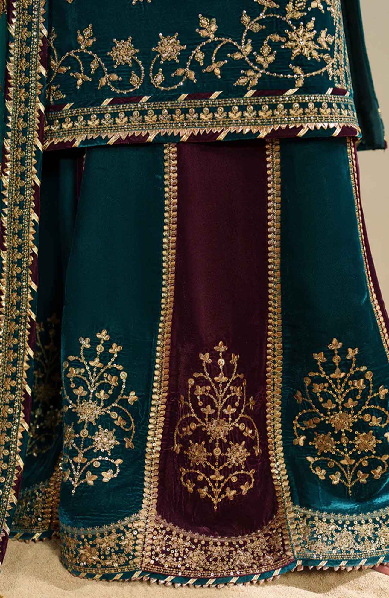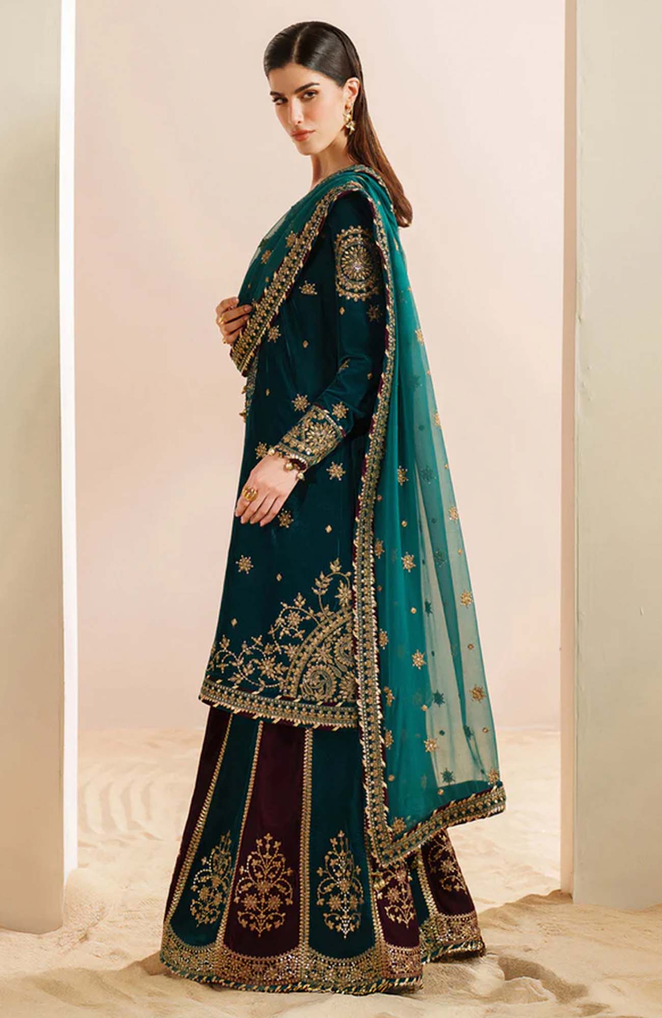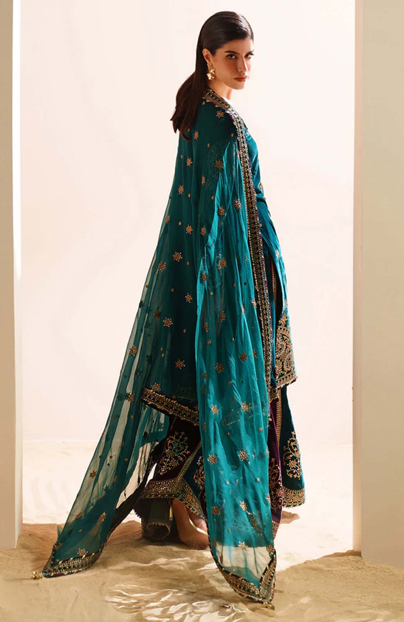 DESCRIPTION: Embroidered Pure Velvet Front Embroidered Pure Velvet Sleeves Embroidered Velvet Front, Back & Sleeves Border Embroidered Pure Velvet Bottom Dyed Pure Velvet Back Embroidered Crinkle Chiffon Dupatta Embroidered Pure Velvet Dupatta Borders