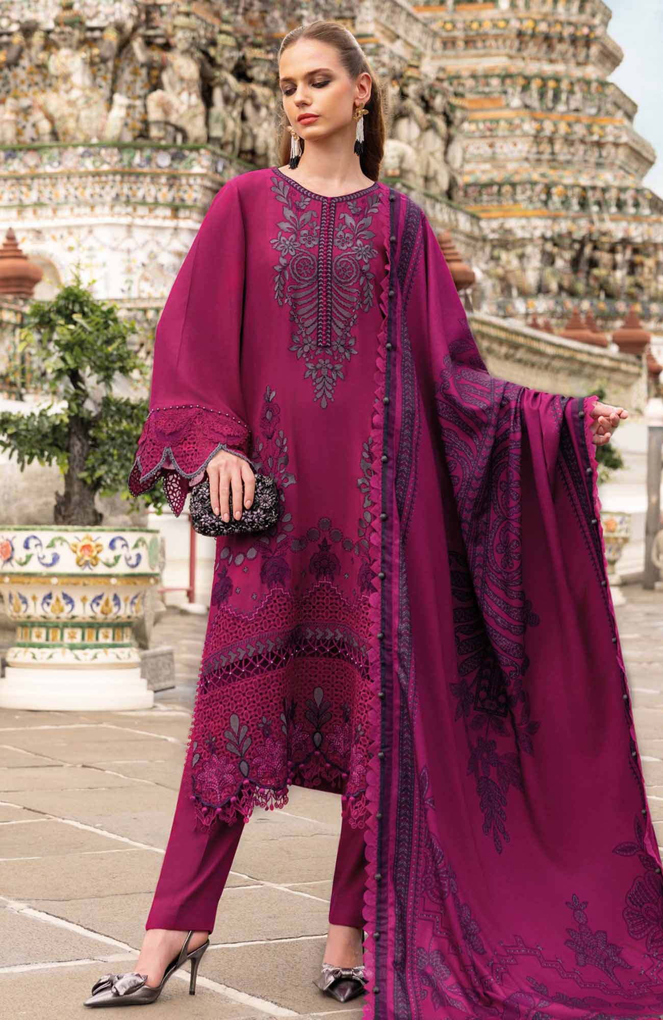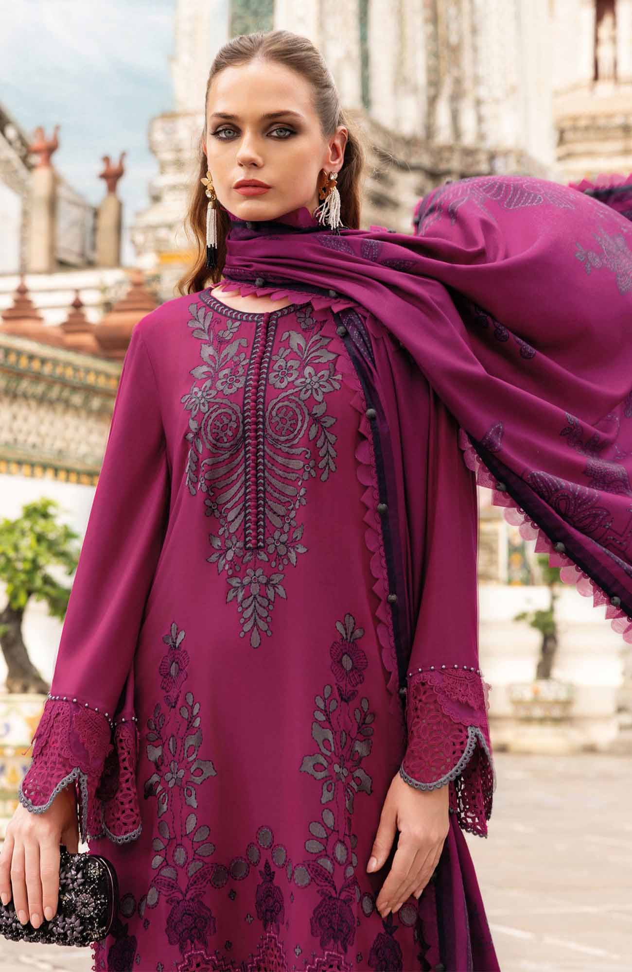 PRODUCT DESCRIPTION:Color: PinkShirtEmbroidered Twill Linen Center PanelEmbroidered Twill Linen Front R+L PanelsDyed Linen Back & SleevesTrouserDyed Linen TrouserShawlPrinted Wool Shawl