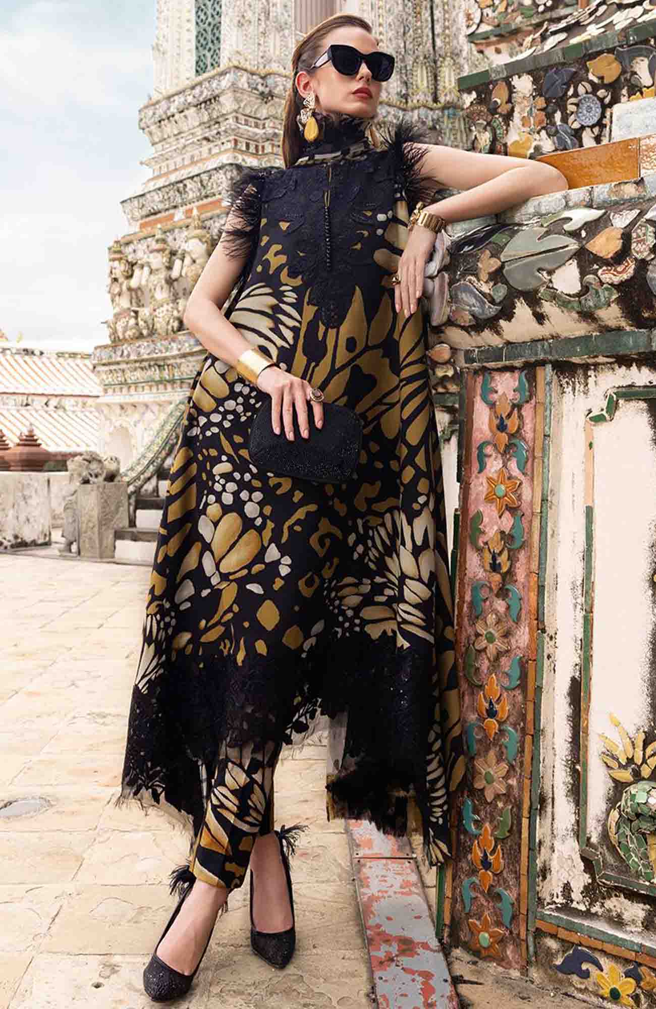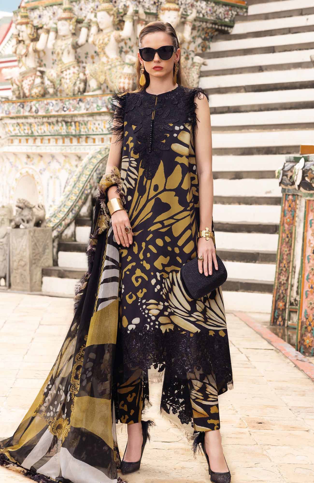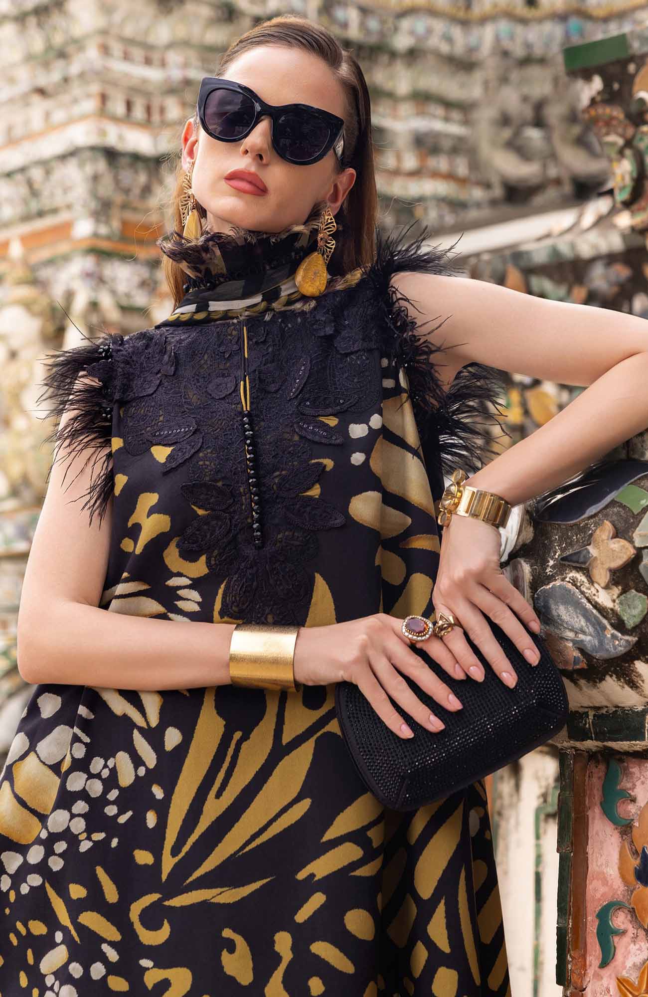 DESCRIPTION:Color: BlackShirtEmbroidered Organza Neck Patch & 3D FlowersPrinted Linen ShirtEmbroidered Organza PattiTrouserPrinted Linen TrouserDupattaPrinted Chiffon Dupatta