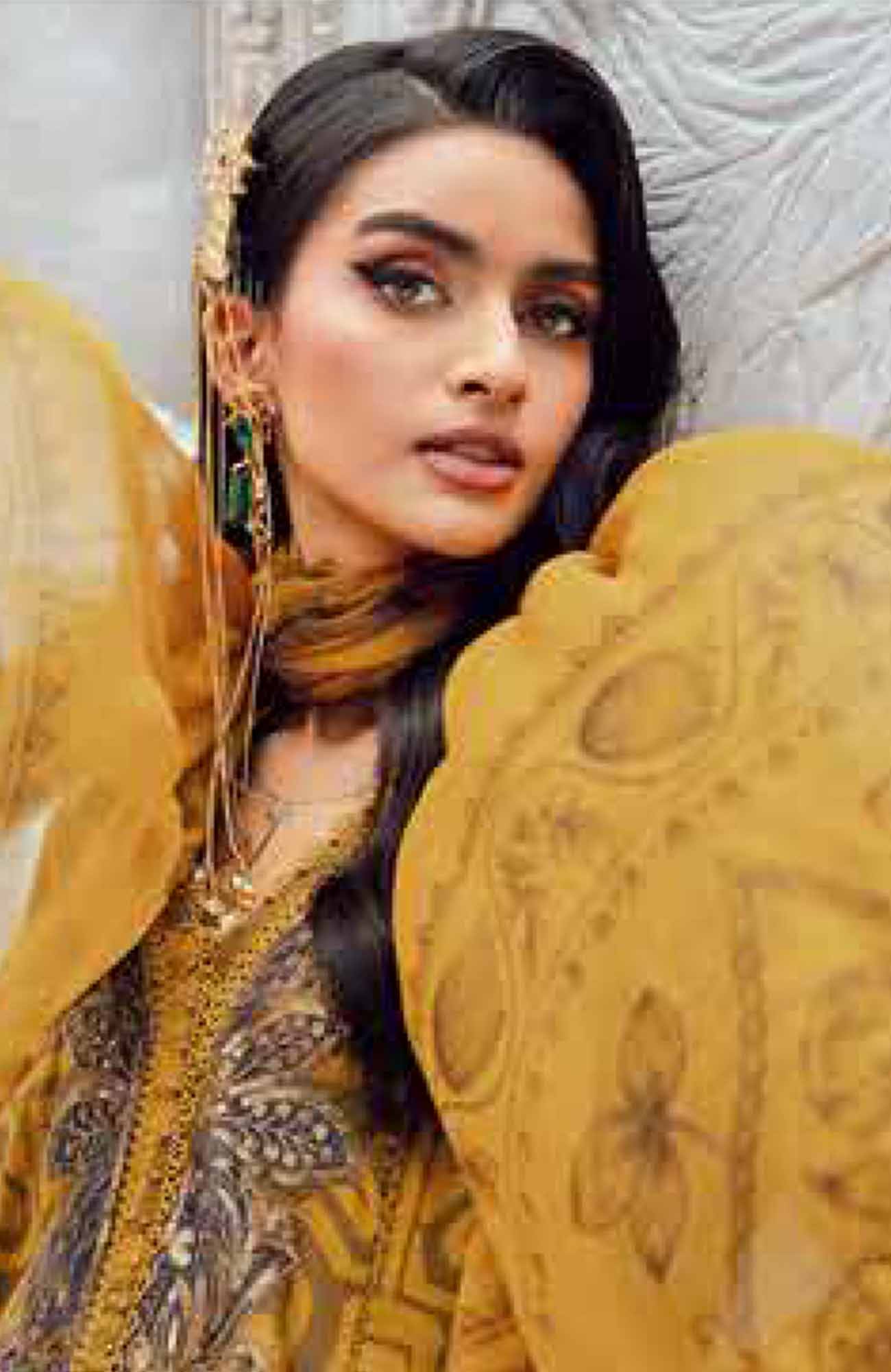 DESCRIPTION :ShirtPrinted ShirtEmbroidered Velvet Neck PatchEmbroidered Velvet Right & Left Panel LaceEmbroidered Velvet PattiFabric: CambricColor: MustardTrouserDyed TrouserFabric: CambricColor: GreenDupattaPrinted DupattaFabric: ChiffonColor: Mustard