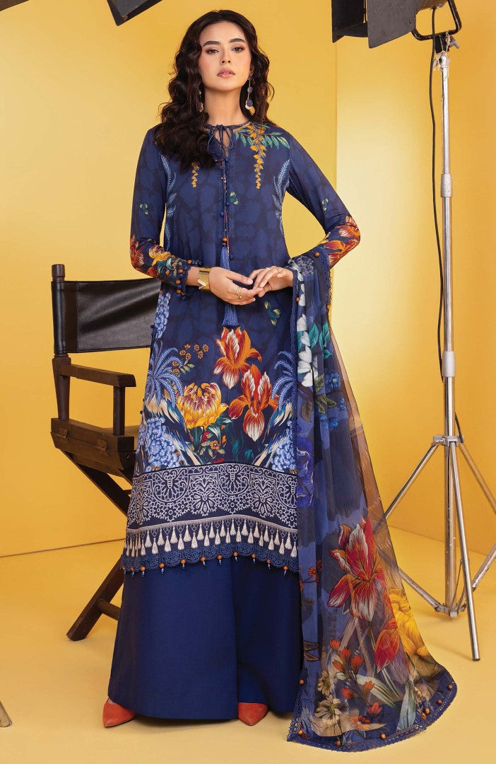 DESCRIPTION:ShirtDigital Printed Shirt 1.88mFabric: LinenTrouserDyed Trouser 2mFabric: LinenDupattaDigital Printed Dupatta 2.5mFabric: Cationic Chiffon