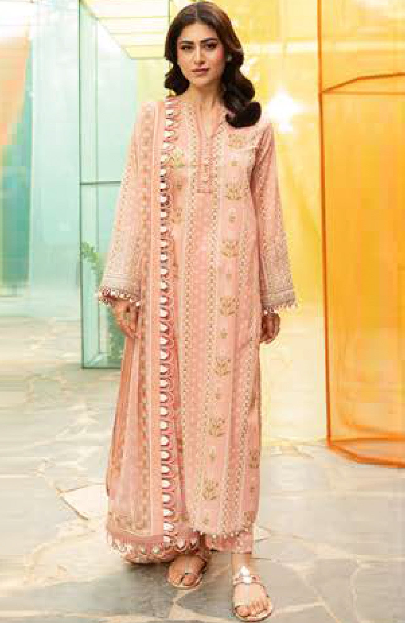 DESCRIPTION:ShirtDigital Printed Shirt 1.88 MetersDyed Embroidered Organza Patti 2 MetersColor: PinkFabric: Slub LawnTrouserDigital Printed Trouser 1.5 MetersColor: PinkFabric: CambricDupattaDigital Printed Dupatta 2.5 MetersColor: PinkFabric: Cationic Chiffon