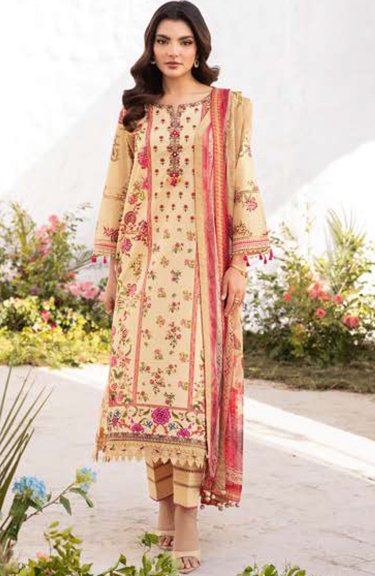 DESCRIPTION:ShirtDigital Printed Shirt 1.88 MetersDyed Embroidered Organza Patti 2 MetersColor: CamelFabric: LawnTrouserDyed Trouser 1.5 MetersColor: CamelFabric: CambricDupattaDigital Printed Dupatta 2.5 MetersColor: CamelFabric: Cationic Chiffon