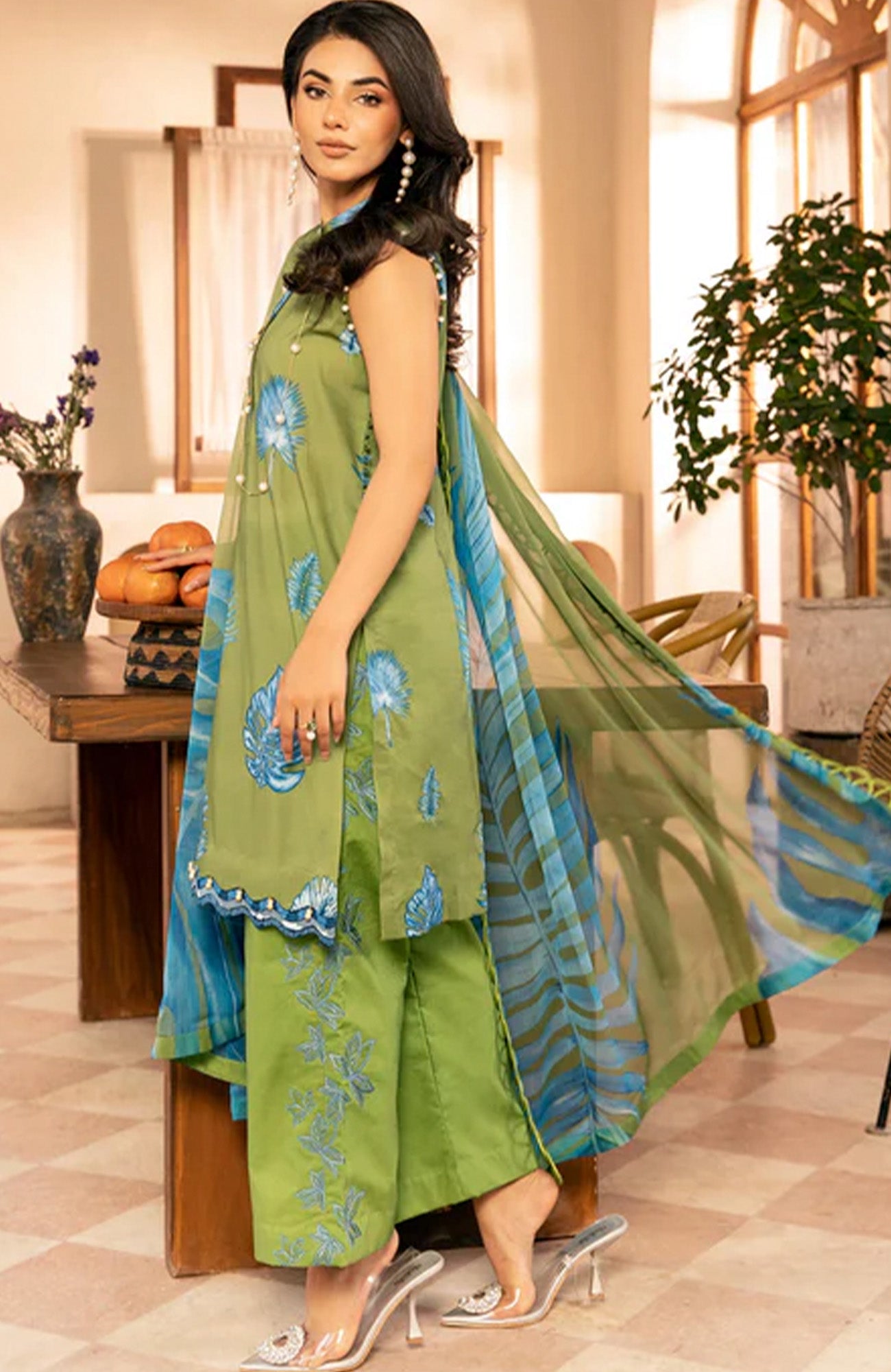 DESCRIPTION:ShirtDigital Printed Shirt 1.88 MetersDyed Embroidered Organza Patti 1 MeterFabric: LawnColor: GreenTrouserDyed Trouser 1.5 MetersFabric: CambricColor: GreenDupattaDigital Printed Dupatta 2.5 MetersFabric: Cationic ChiffonColor: Green