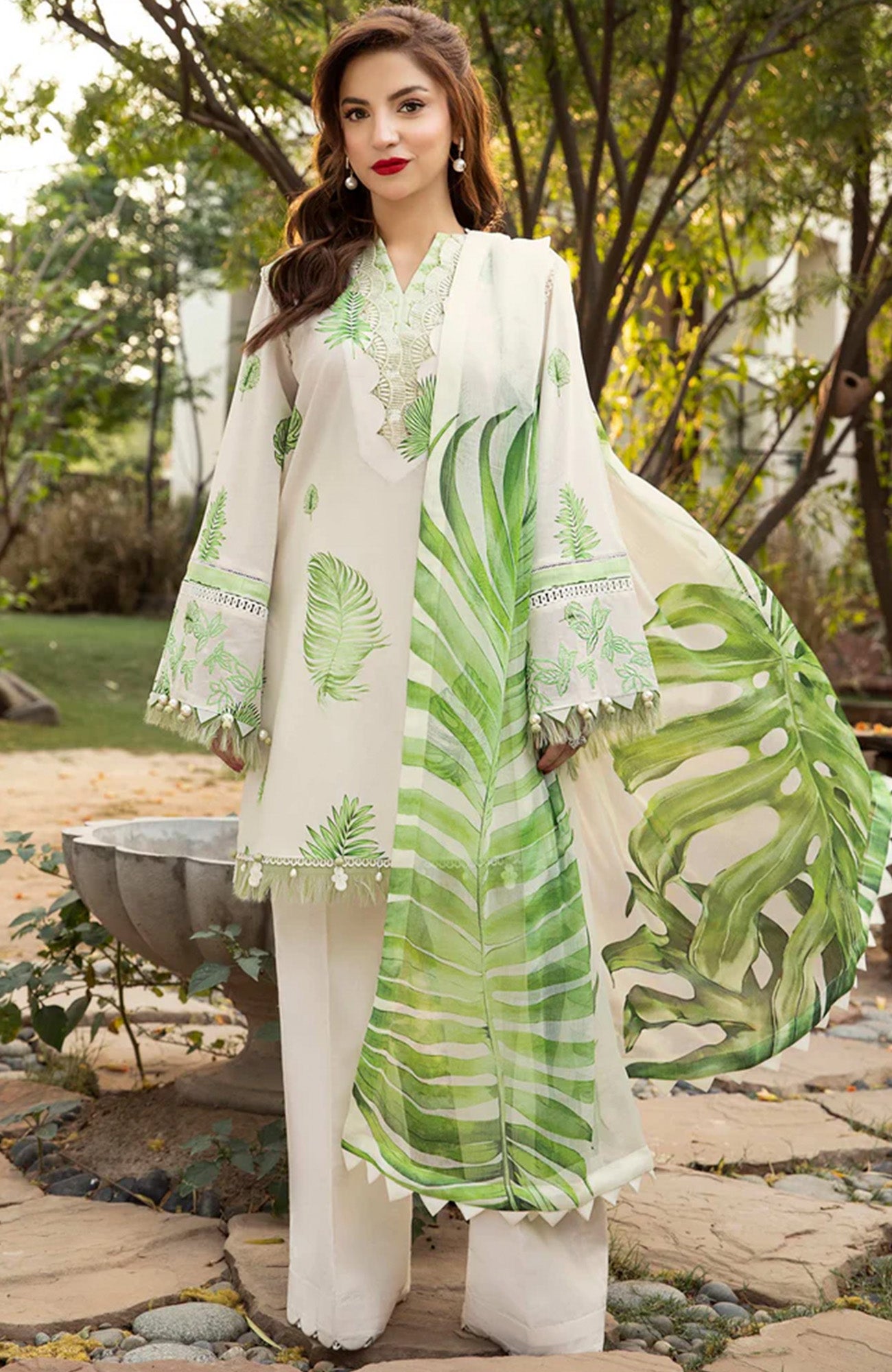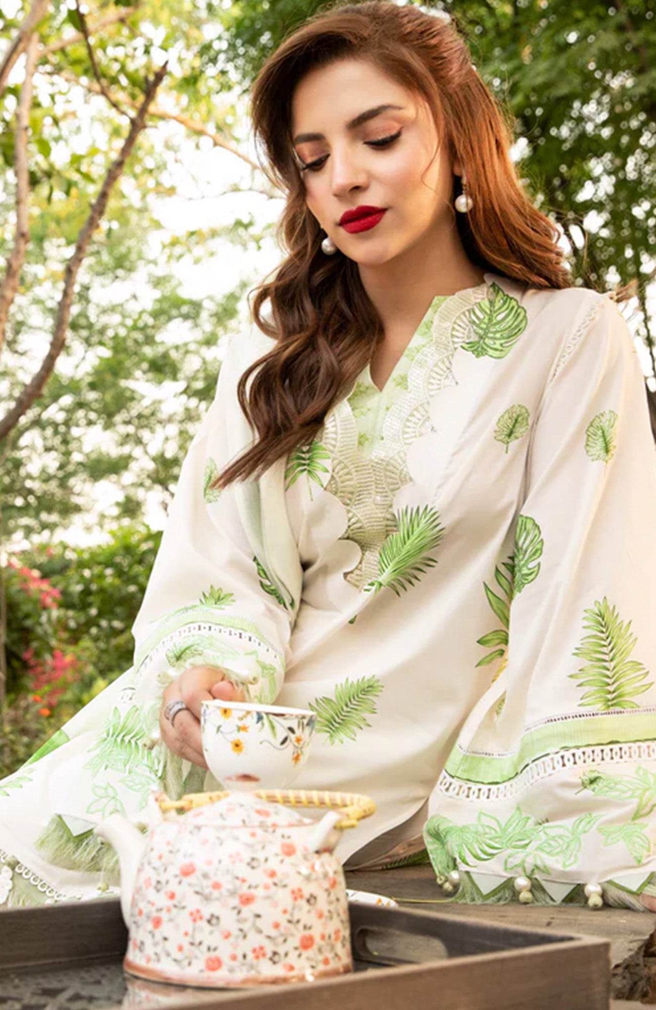 DESCRIPTION:ShirtDigital Printed Shirt 1.88 MetersDyed Embroidered Organza Patti 1 MeterFabric: LawnColor: Cream WhiteTrouserDyed Trouser 1.5 MetersFabric: CambricColor: Cream WhiteDupattaDigital Printed Dupatta 2.5 MetersFabric: Cationic ChiffonColor: Cream White