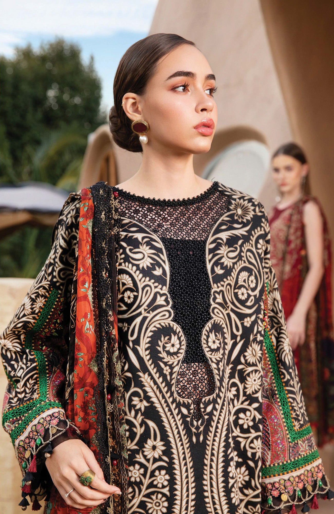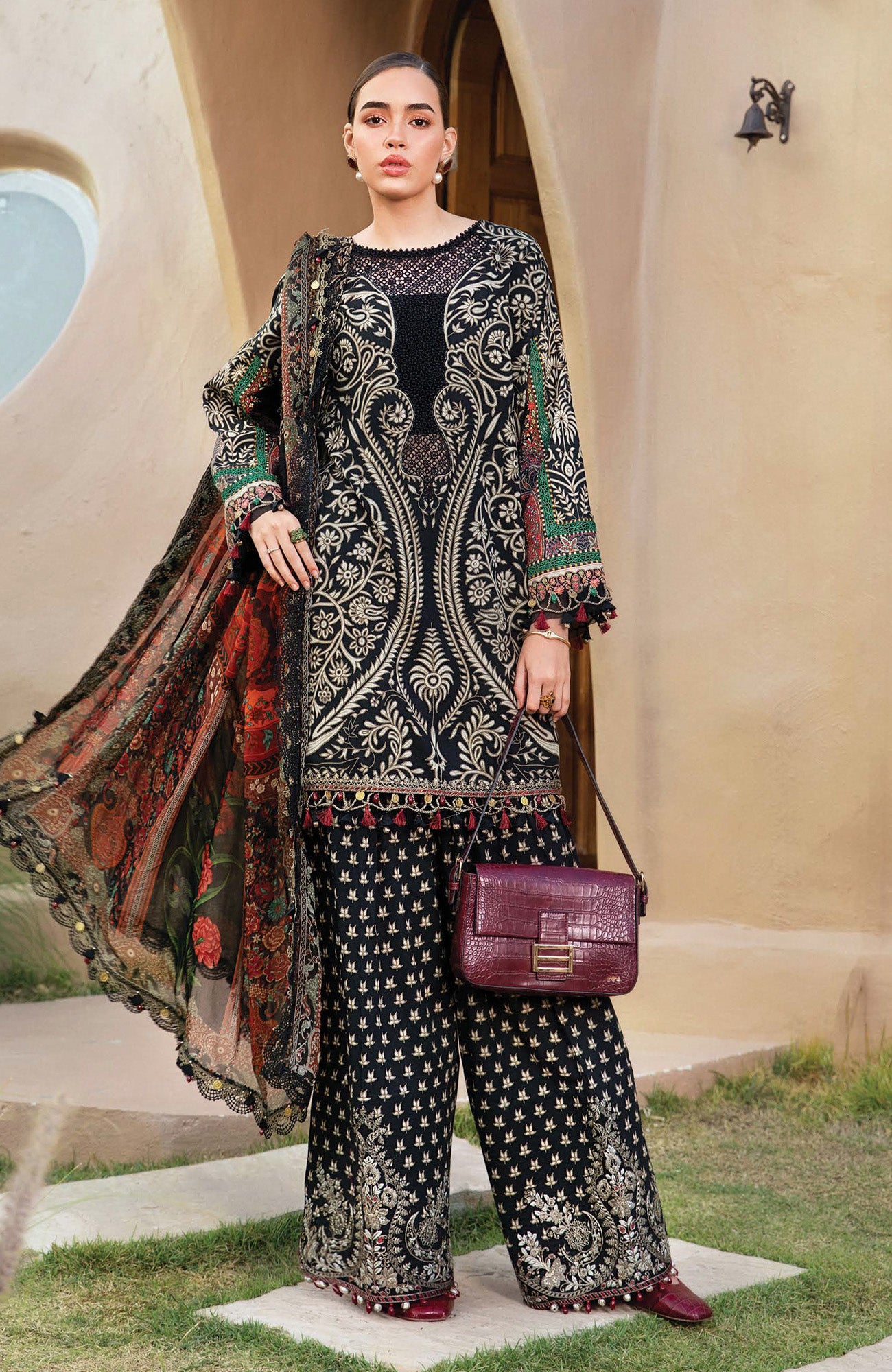 DESCRIPTION:ShirtPrinted ShirtEmbroidered Neck PatchEmbroidered Lawn PatchEmbroidered Organza PattiFabric: LawnColor: BlackTrousersPrinted TrouserFabric: CambricColor: BlackDupattaPrinted DupattaFabric: SilkColor: Black