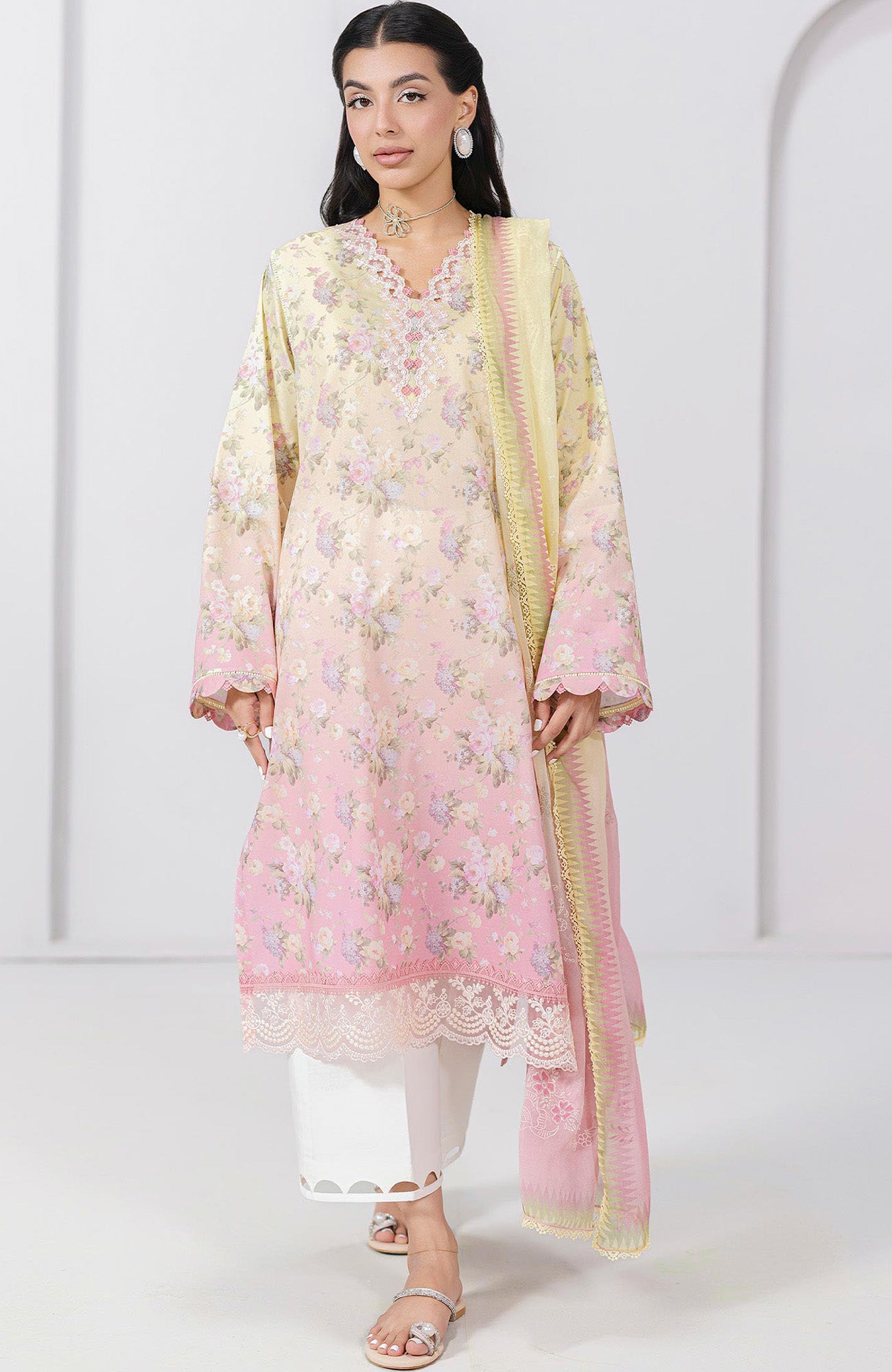 DESCRIPTION:ShirtDigital Printed ShirtEmbroidered Border (Front)Embroidered Lace (Shirt)DupattaDigital & Block Printed Dupatta (Chiffon)TrouserDyed Trouser