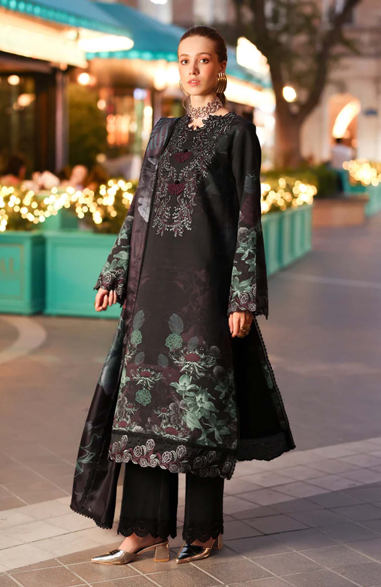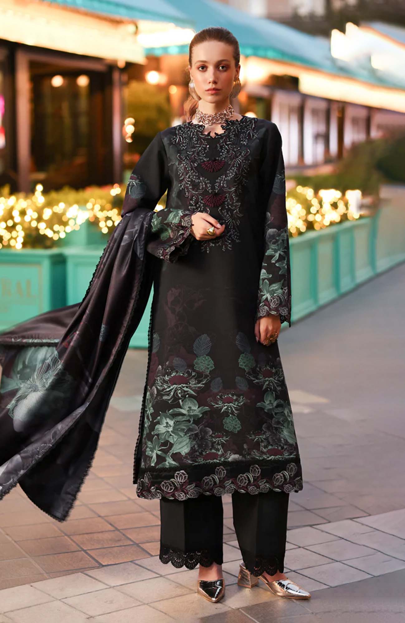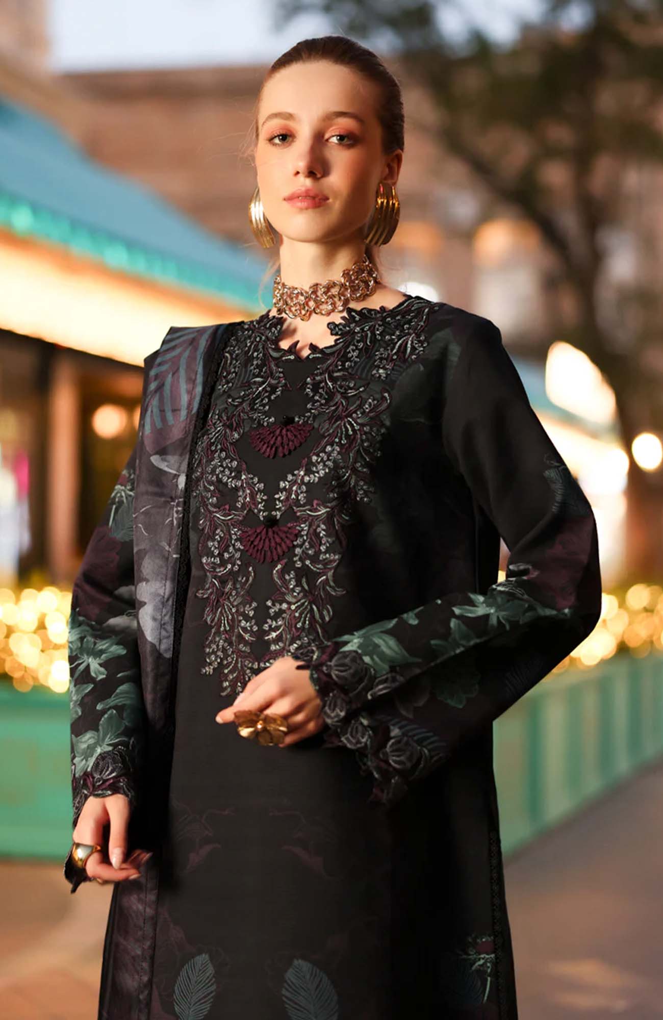 Dyed Organza Embroidered Front Neck Line 1 Pc Dyed Organza Embroidered Front Border 30 Inches Dyed Organza Embroidered Sleeve Border 40 Inches Printed Linen Bana Dora Shirt 3 Meter Printed Herringbone Shawl 2.5 Meter Dyed Plain Linen Trouser 2.5 Meter