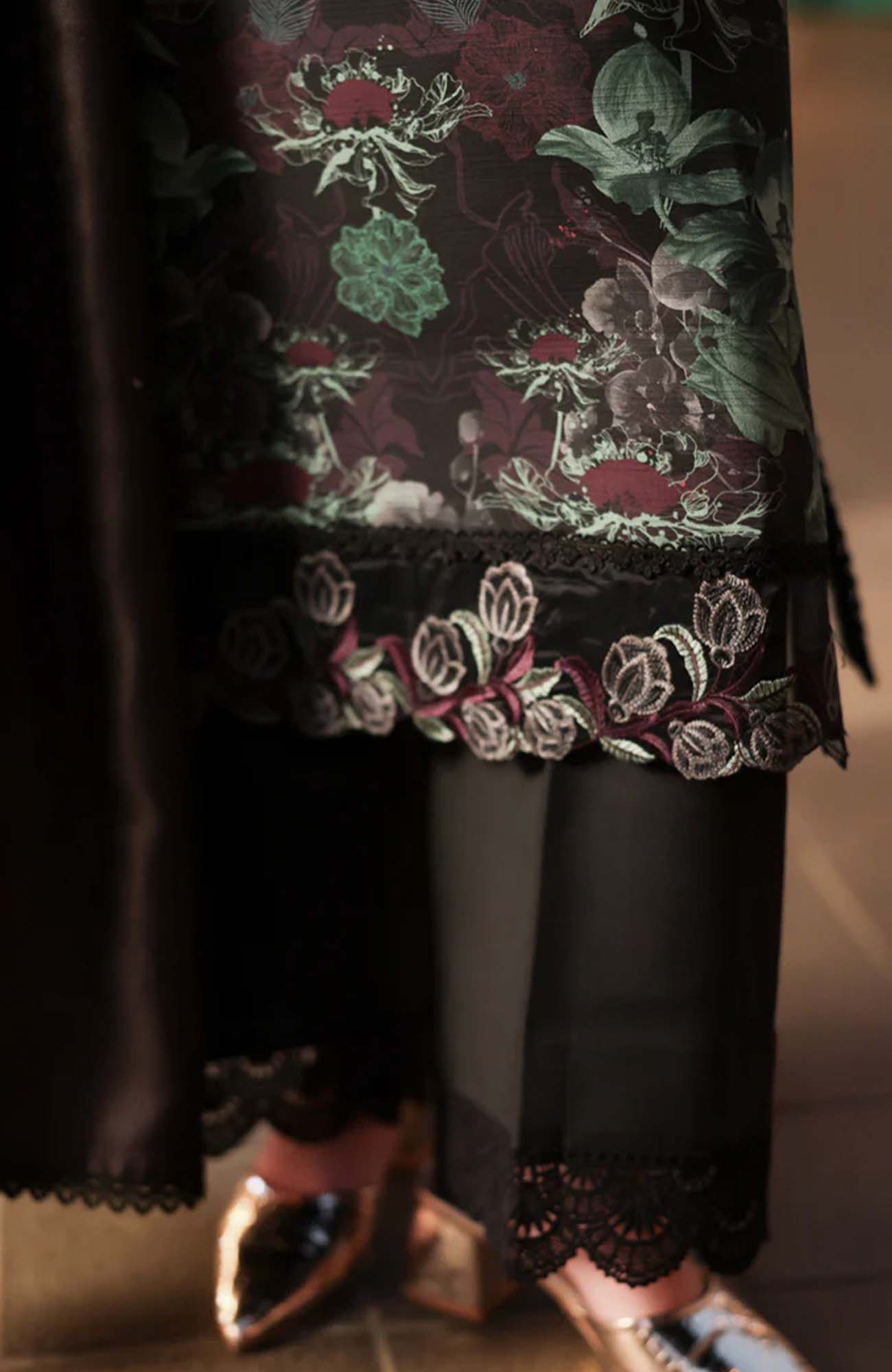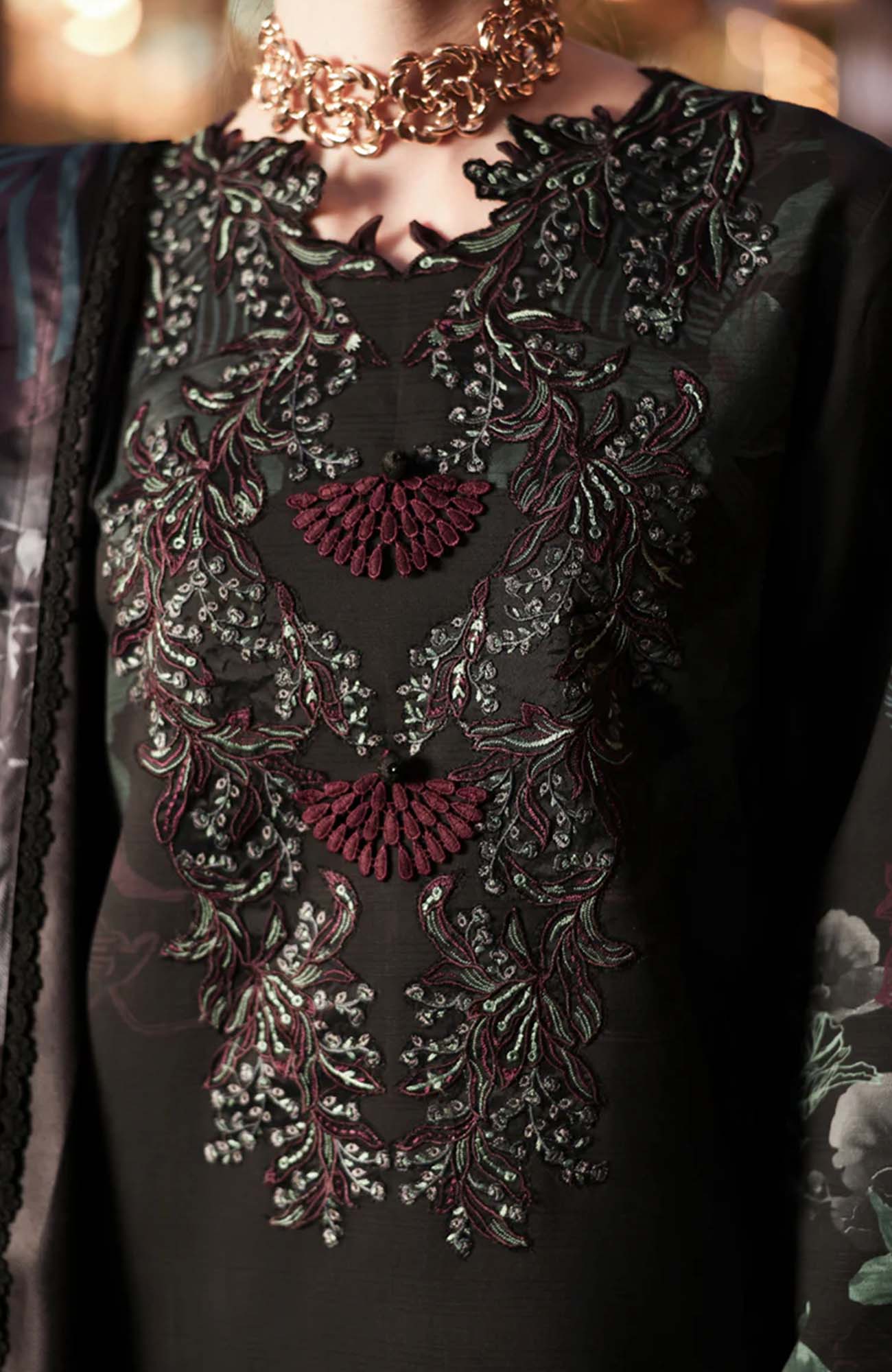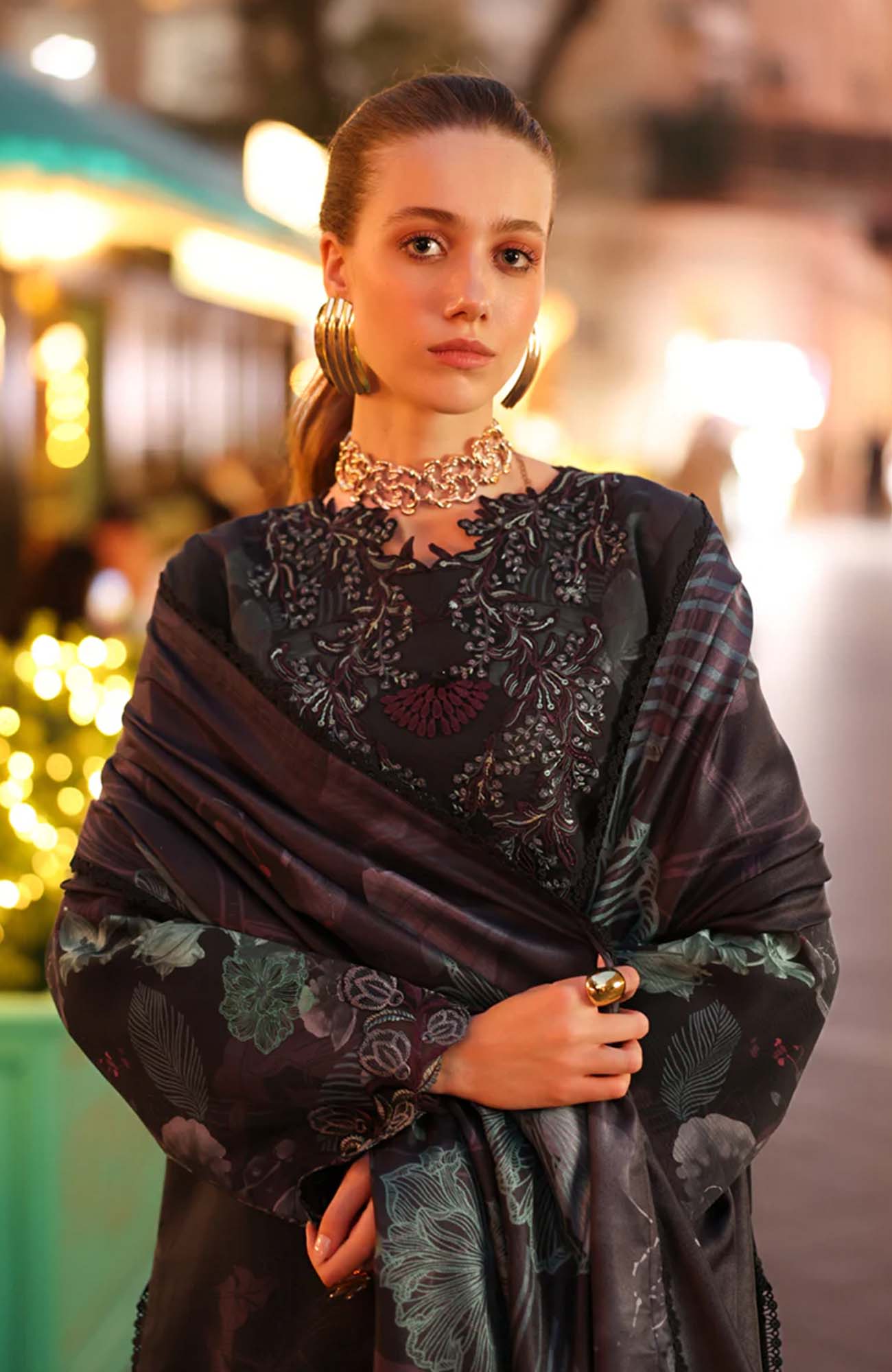 Dyed Organza Embroidered Front Neck Line 1 Pc Dyed Organza Embroidered Front Border 30 Inches Dyed Organza Embroidered Sleeve Border 40 Inches Printed Linen Bana Dora Shirt 3 Meter Printed Herringbone Shawl 2.5 Meter Dyed Plain Linen Trouser 2.5 Meter