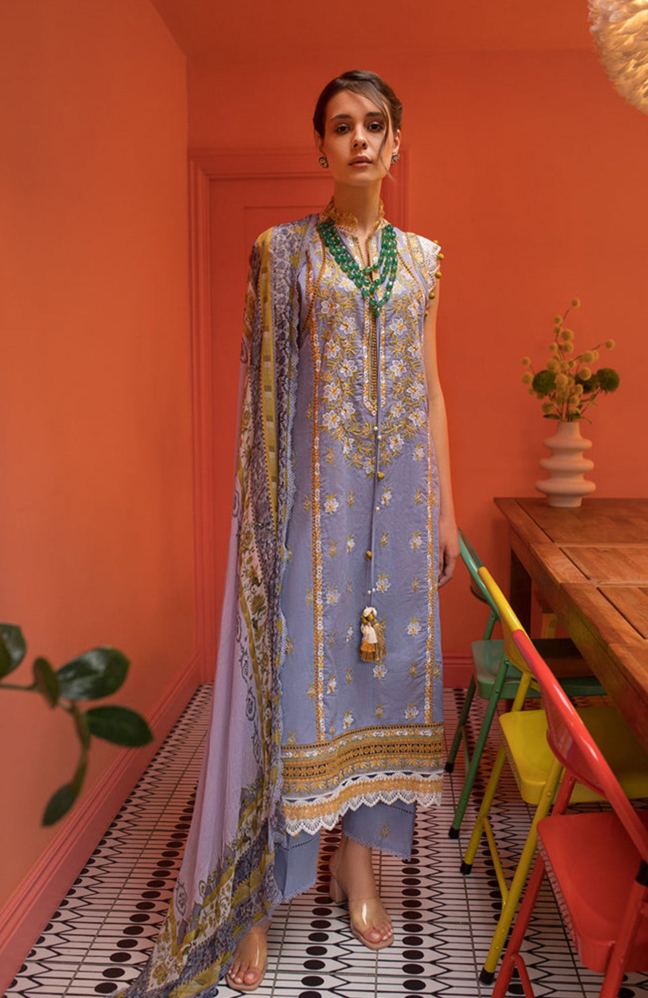 PRODUCT DESCRIPTION: Embroidered Center Panel Embroidered Side Panels Embroidered Sleeves Embroidered Daman Border Plain Dyed Back Embroidered Trousers Printed Chiffon Dupatta