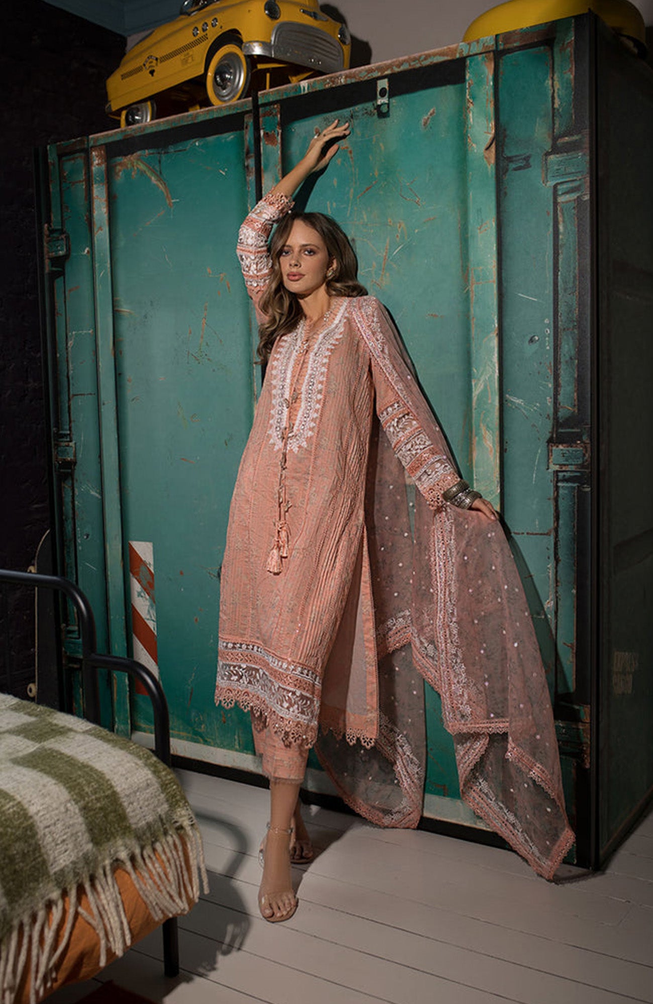 PRODUCT DESCRIPTION: Printed Shirt Embroidered Neckline Patch Embroidered Daman Border Embroidered Sleeves Border Printed Trousers Printed Embroidered Organza Dupatta.