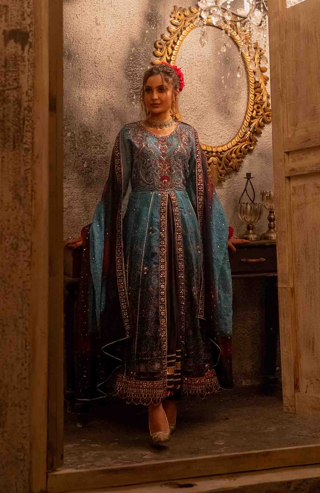 DESCRIPTION: READY TO WEAREmbroidered Chiffon Maxi (Open Style) Simple Malia Crap Trouser Embroidered Chiffon Dupatta With (Crush Inner)